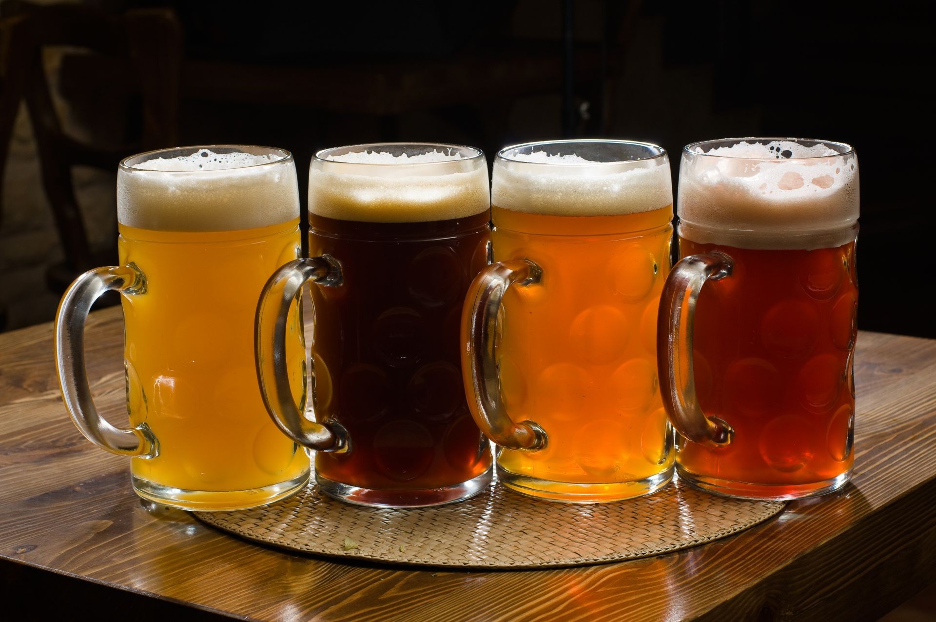 Cuatro vasos de cerveza con diferentes tipos de cerveza