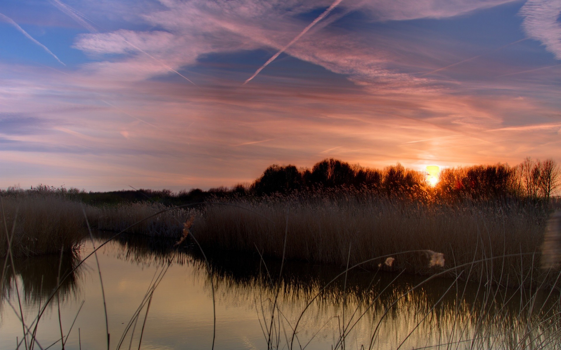 Amanecer en el estanque. Plantas y agua