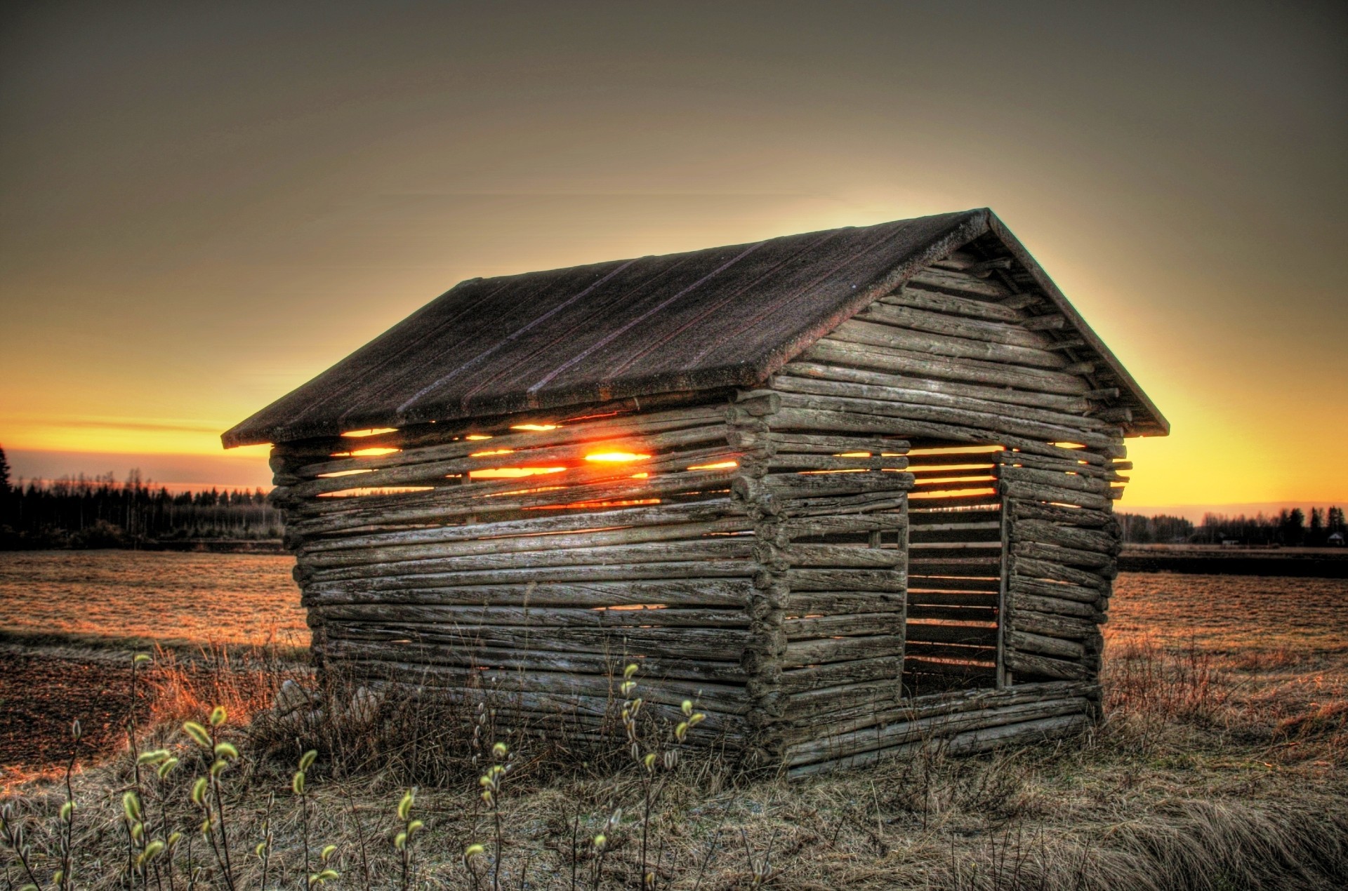 Amanecer en el fondo de una antigua casa en el campo