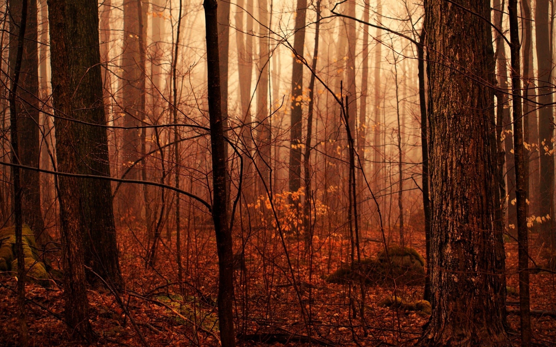 Bosque de otoño con un denso sotobosque. Niebla al amanecer
