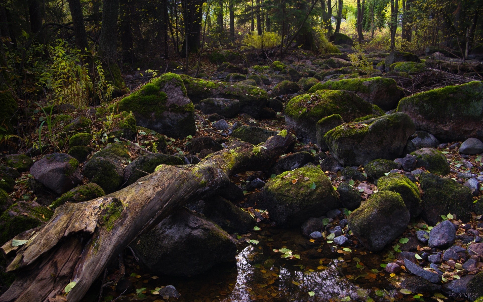 Brumoso, bosque fresco vista de abajo hacia arriba