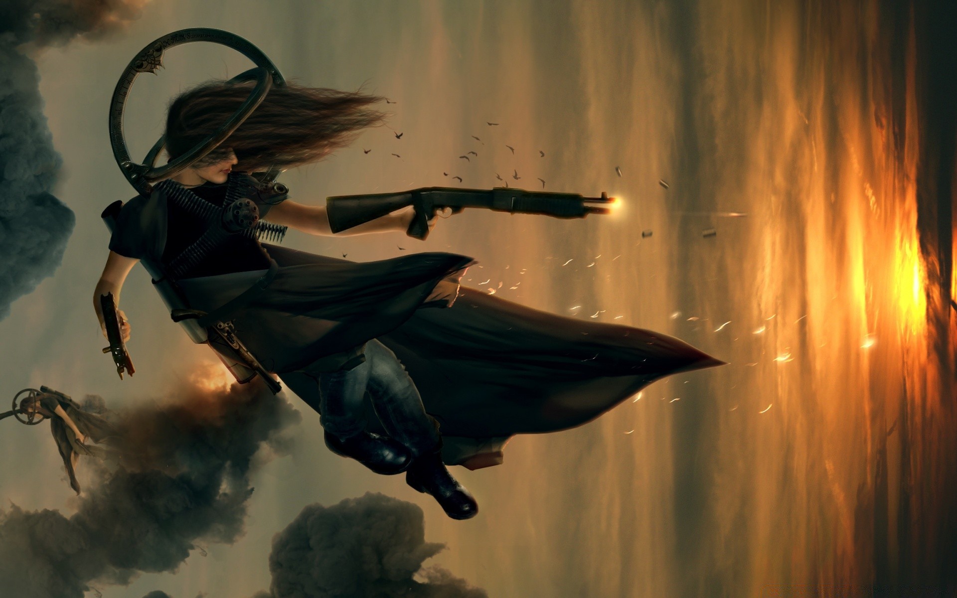 Un hombre armado con una ametralladora va por detrás y monta un tanque