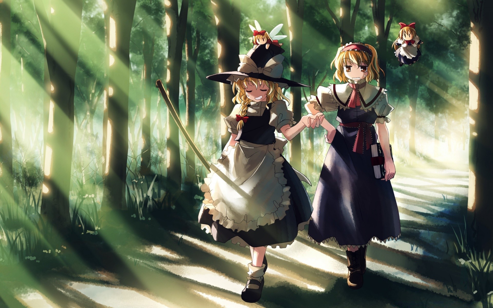 Chicas anime caminando por el bosque. Bruja, hadas. Rayos de sol entre los árboles