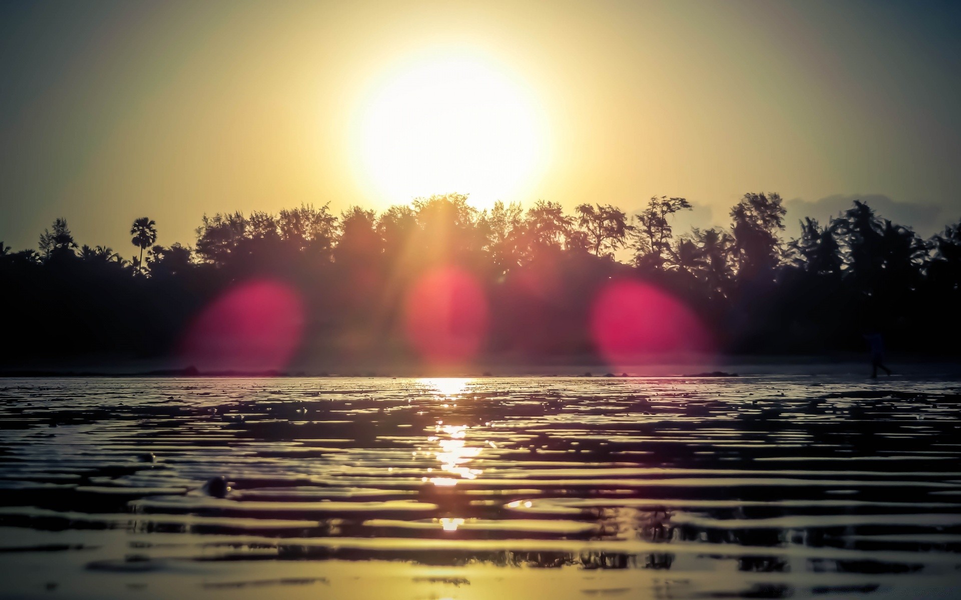 Gráficos 3D agua y rocas en el fondo del amanecer