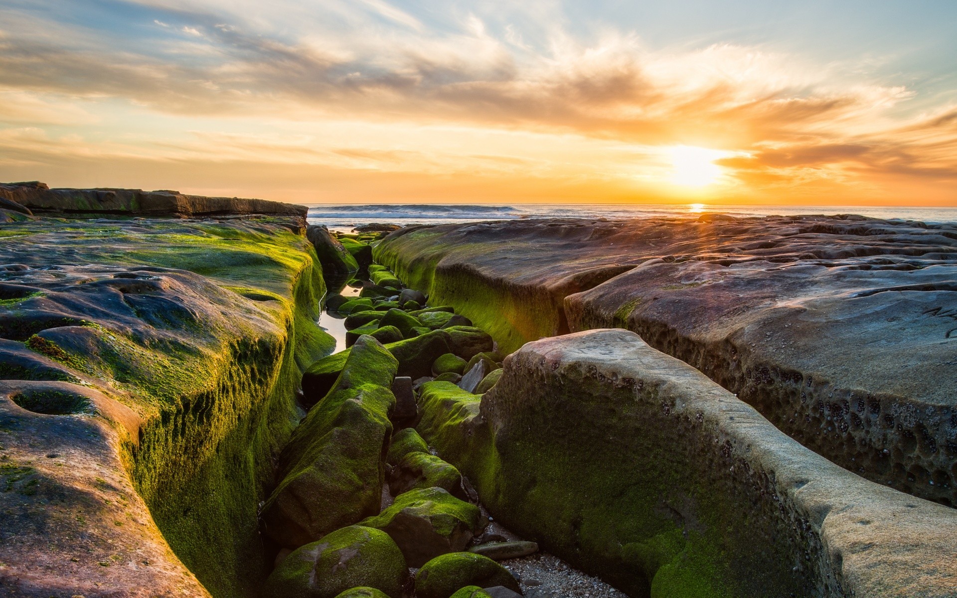Puesta de sol dorada. Reflejo del sol en el agua