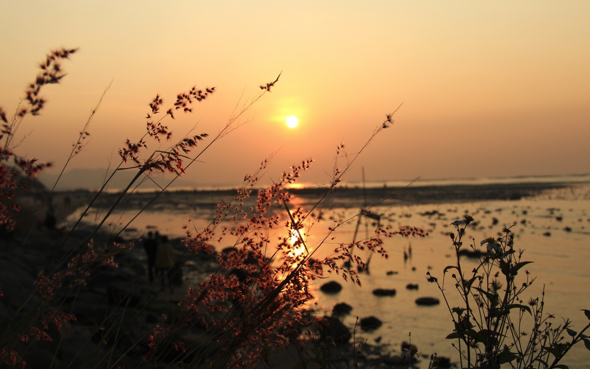 En el reflejo del agua se ve el puente en el fondo de la puesta de sol