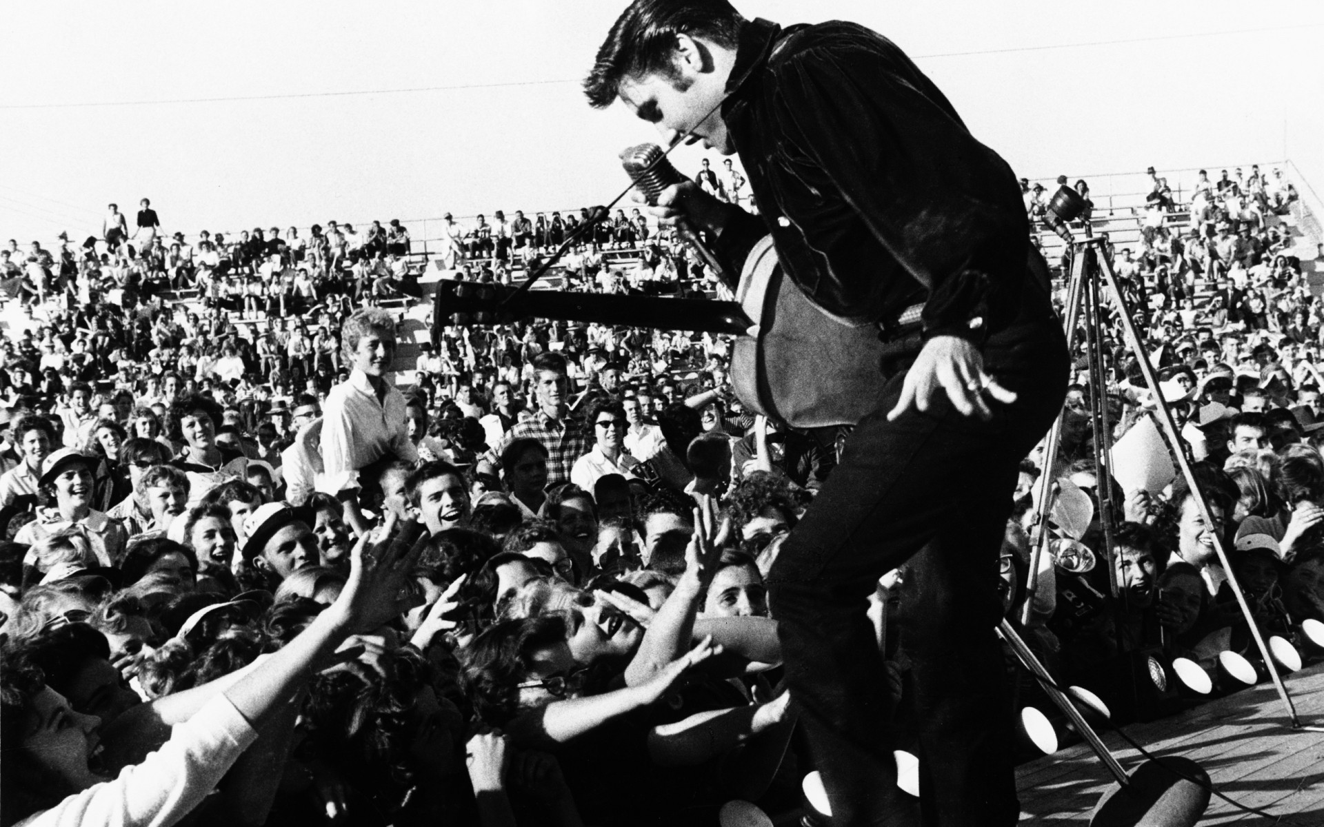 Foto en blanco y negro. Elvis en el escenario frente a la multitud