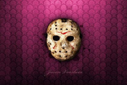La máscara cuelga en la pared sobre el fondo del papel pintado del bardoLa máscara cuelga en la pared sobre el fondo del papel pintado del bardo