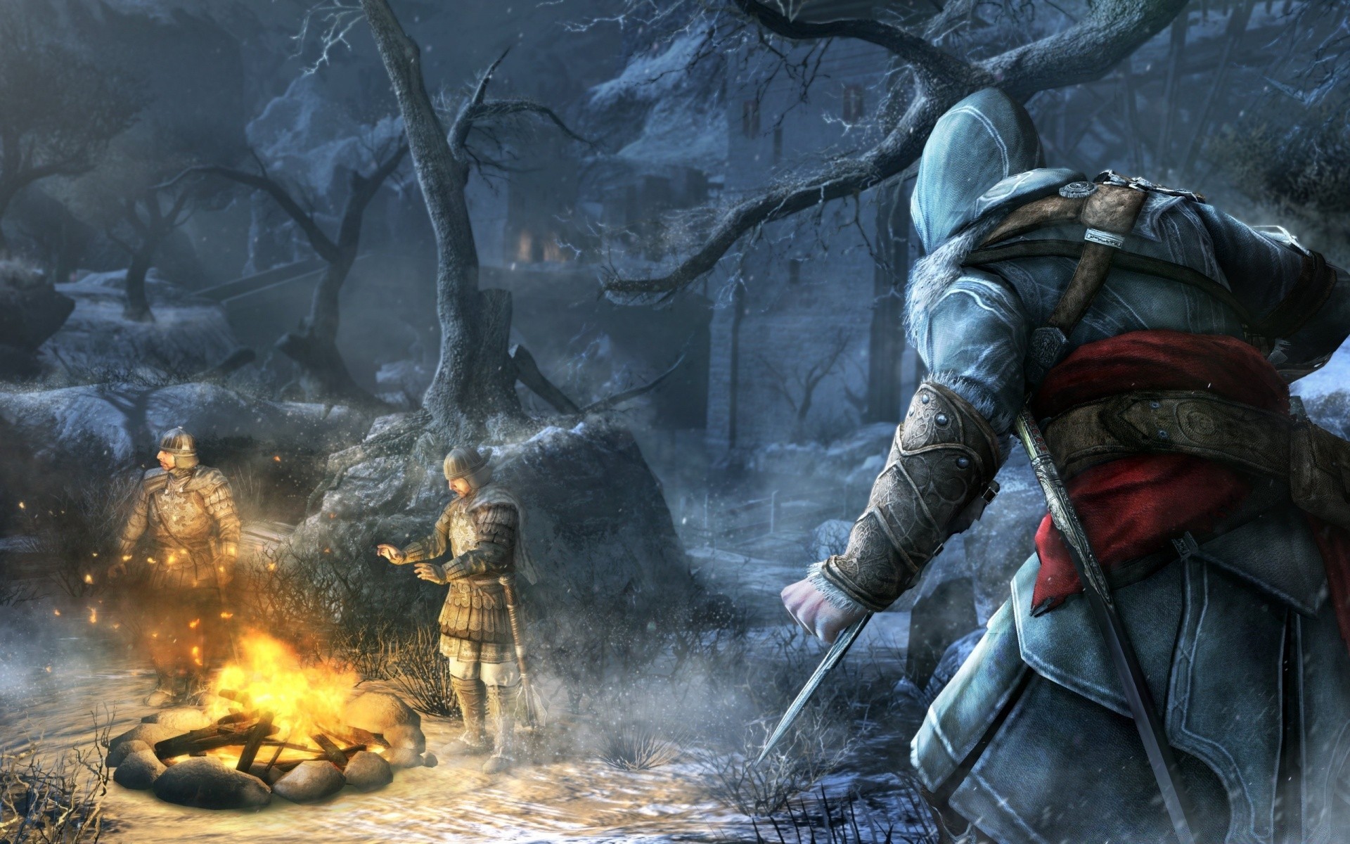 Escena con guerreros y guardias del juego de ordenador assassin's creed