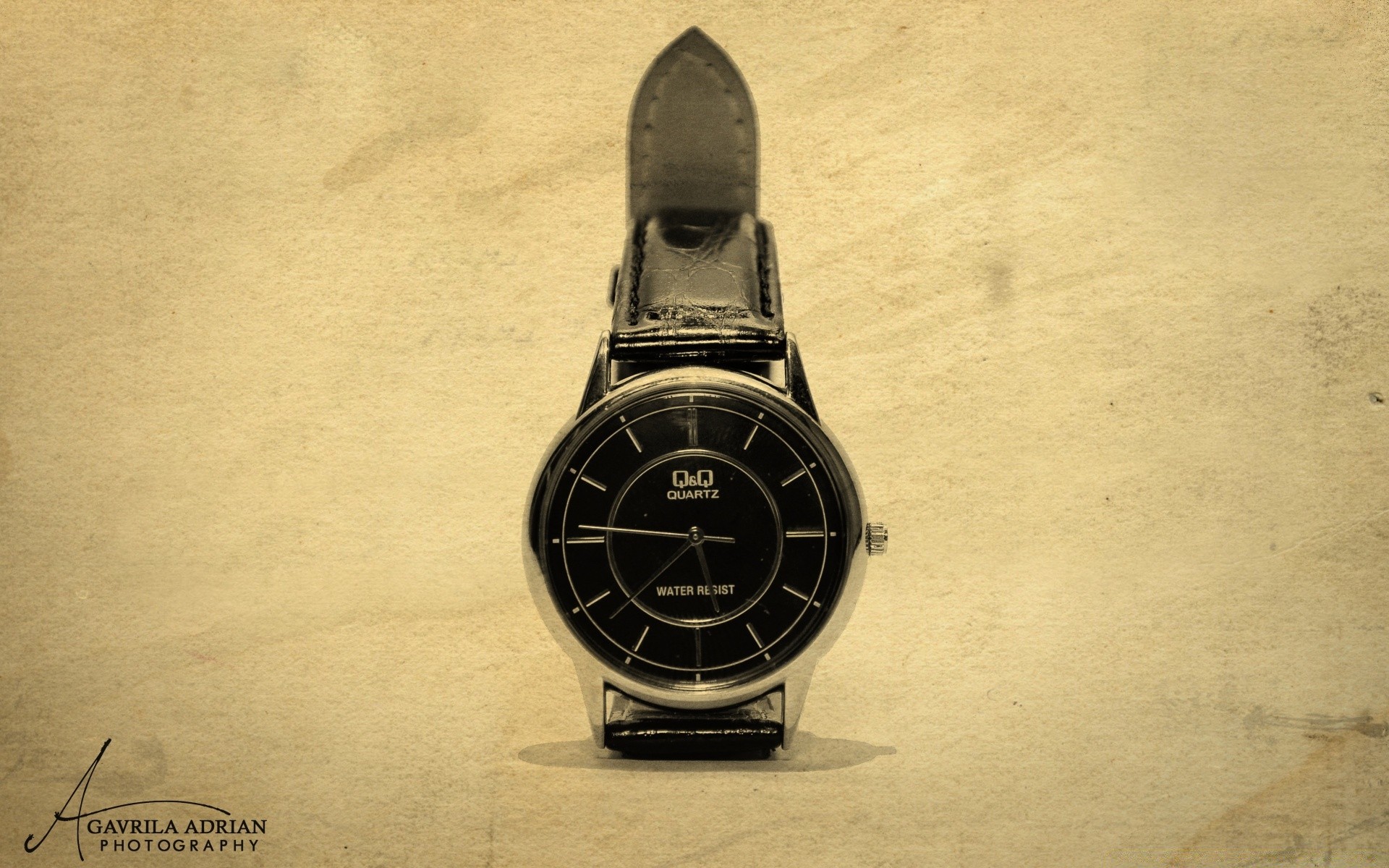 Reloj con esfera negra y correa sobre fondo claro