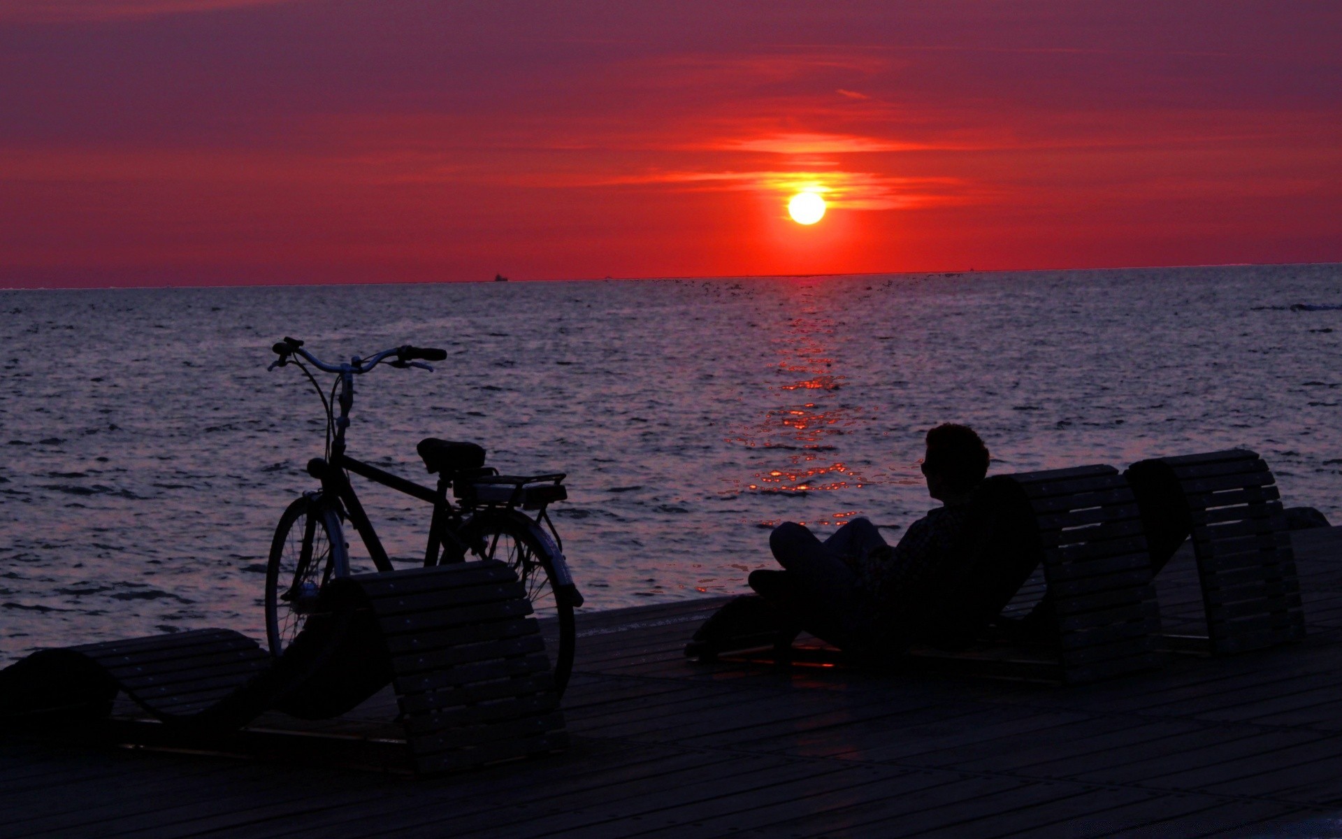 Hombre al atardecer junto al mar con una bicicletaHombre al atardecer junto al mar con una bicicleta