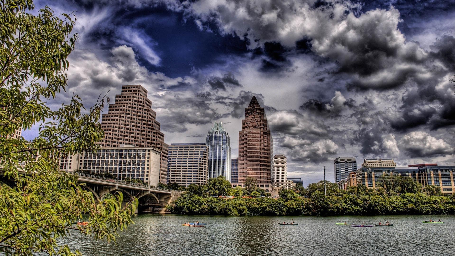 Arquitectura de la ciudad nocturna con un largo puente sobre la superficie del agua