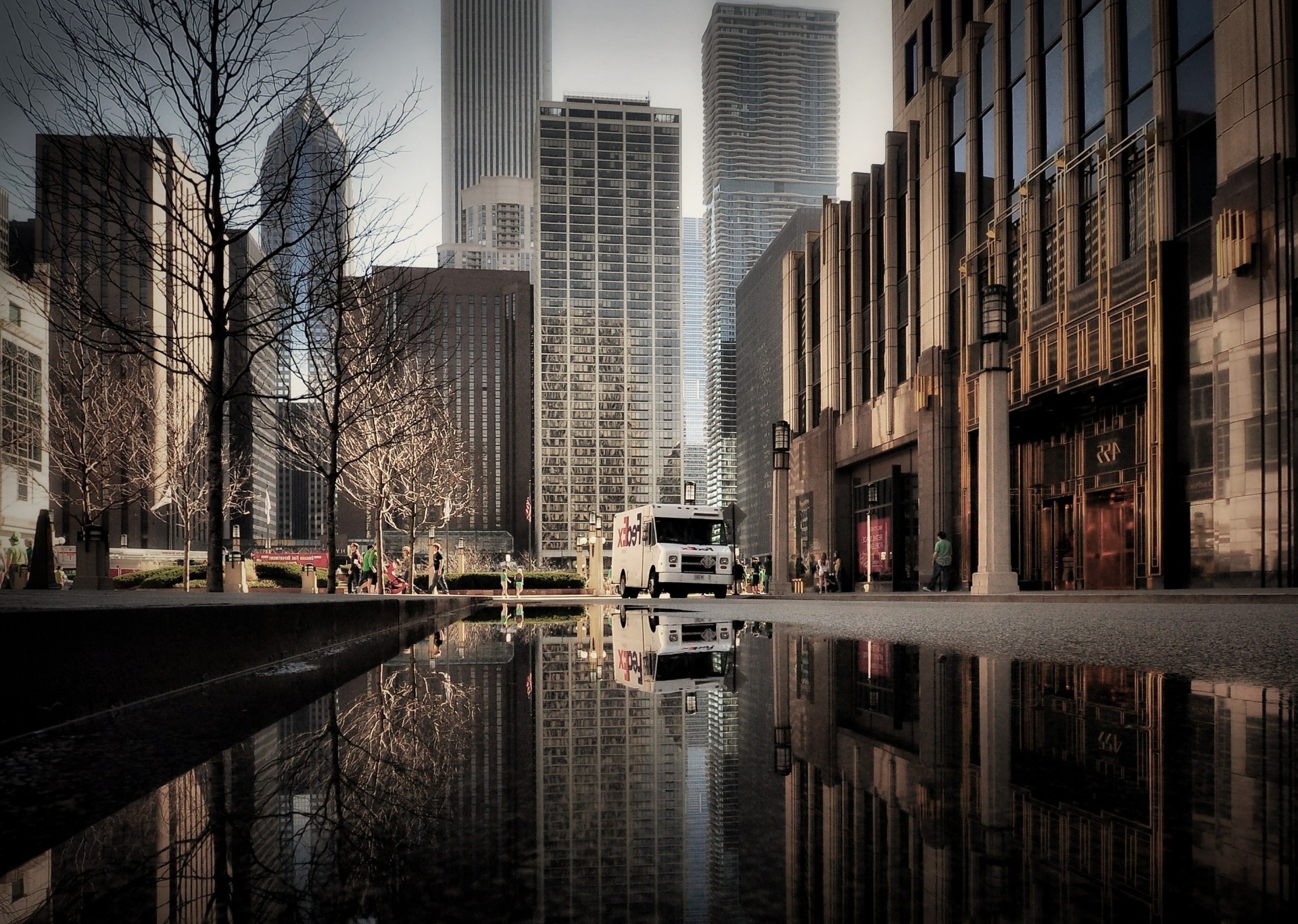 Vista de pájaro por la noche gran ciudad con rascacielos iluminados por luces