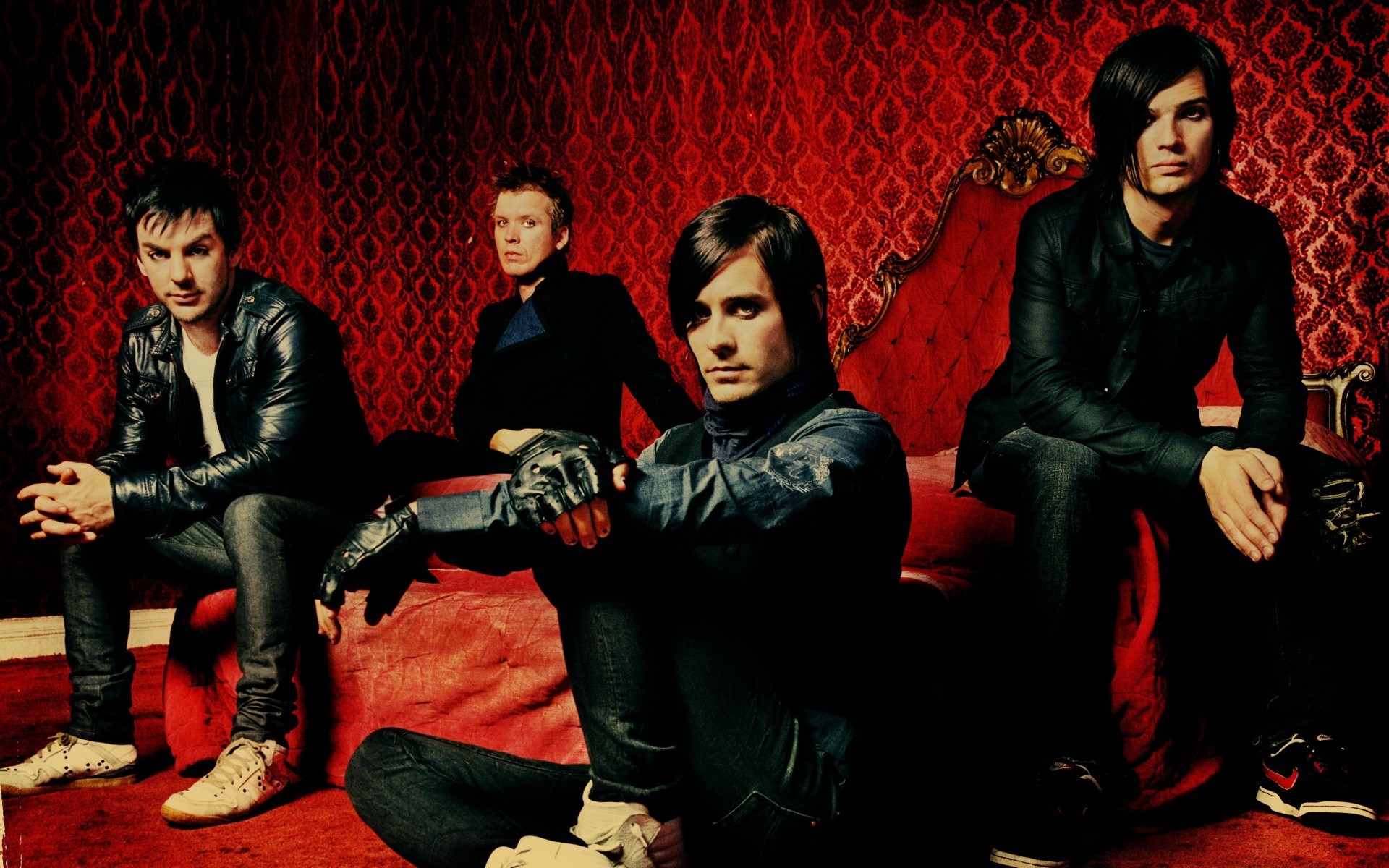 Cuatro chicos con chaquetas de cuero en la habitación roja