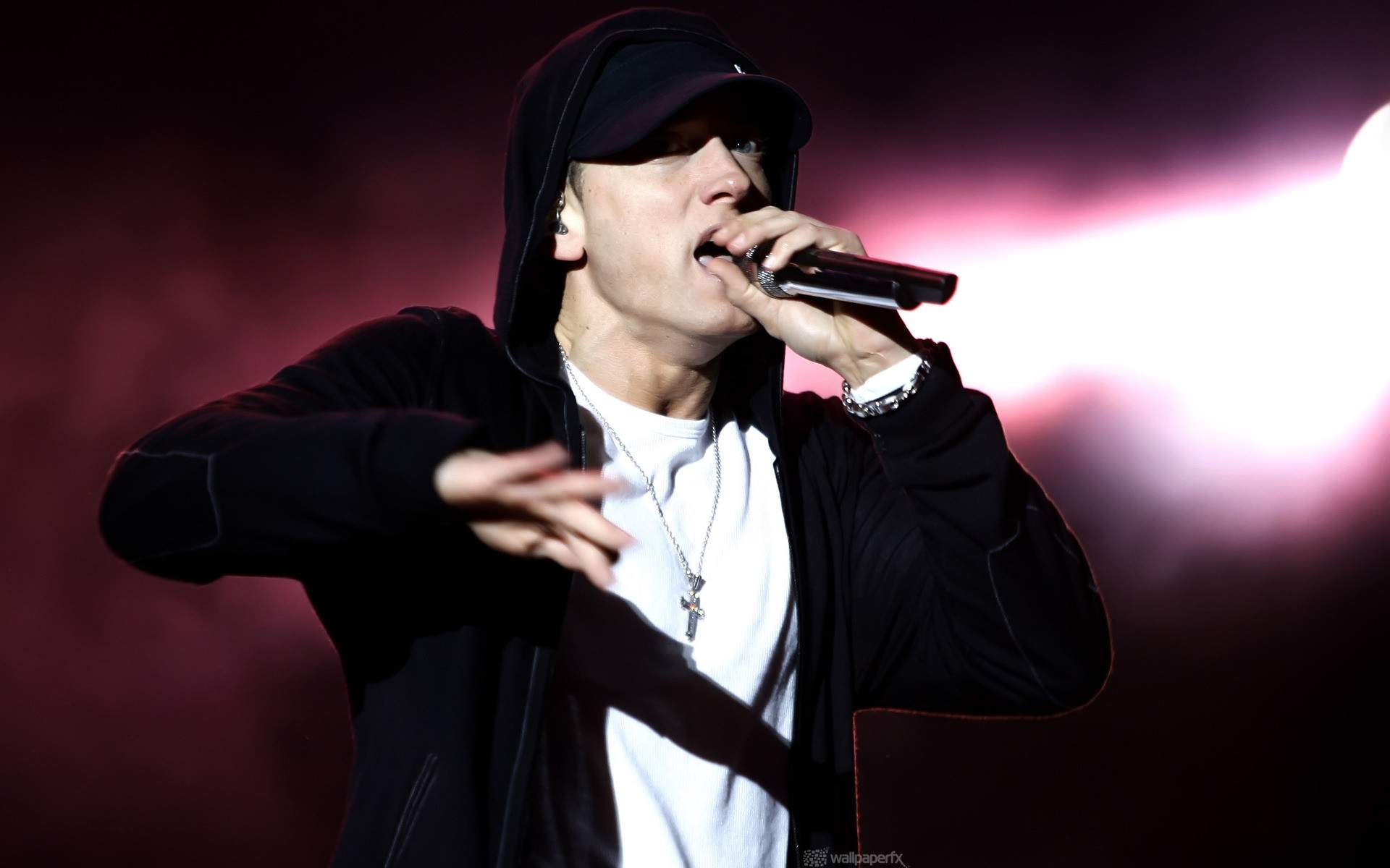 Intérprete de pelo oscuro con chaqueta de cuero y gafas canta en el micrófono