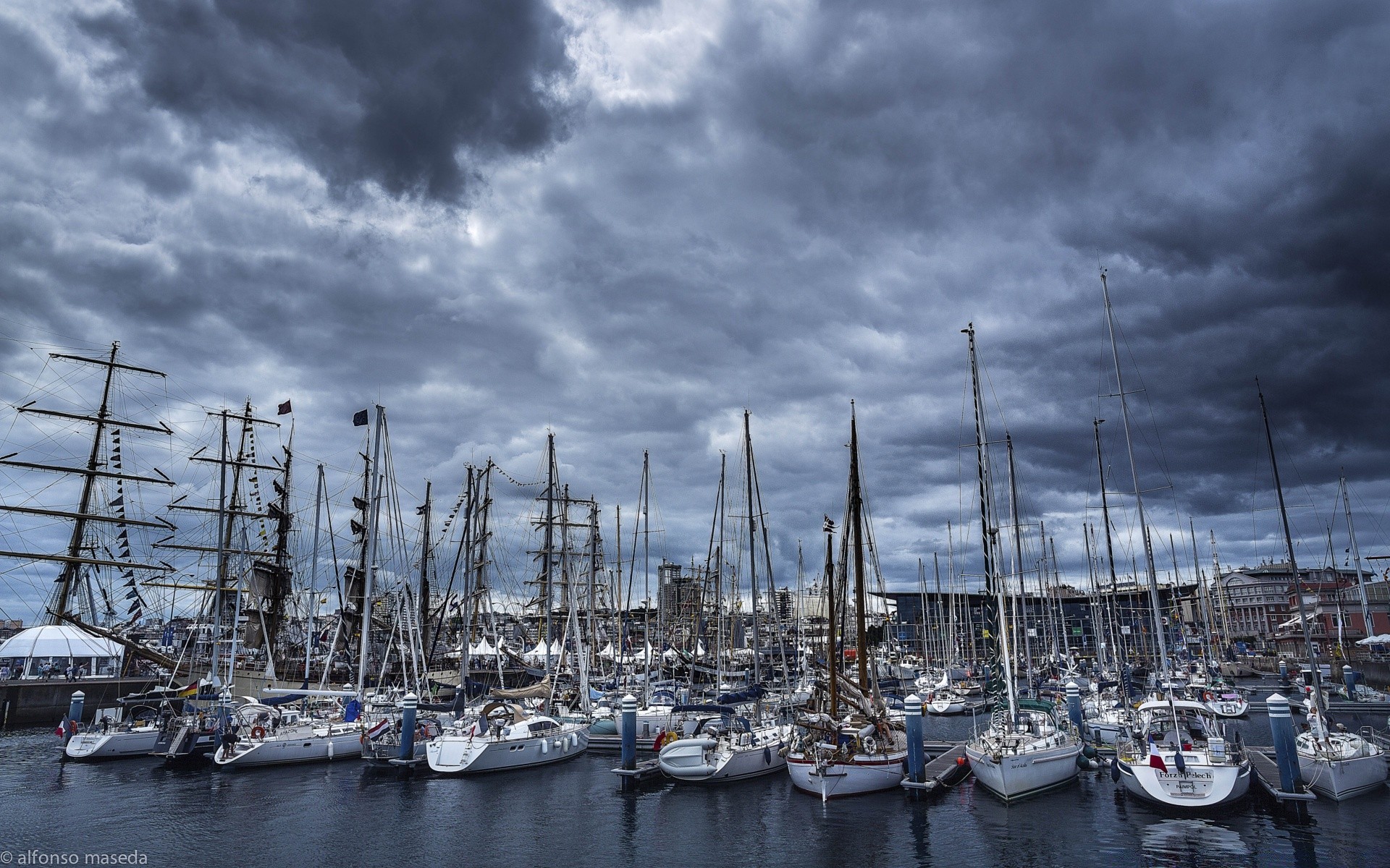 Un puerto con yates y veleros contra un cielo gris