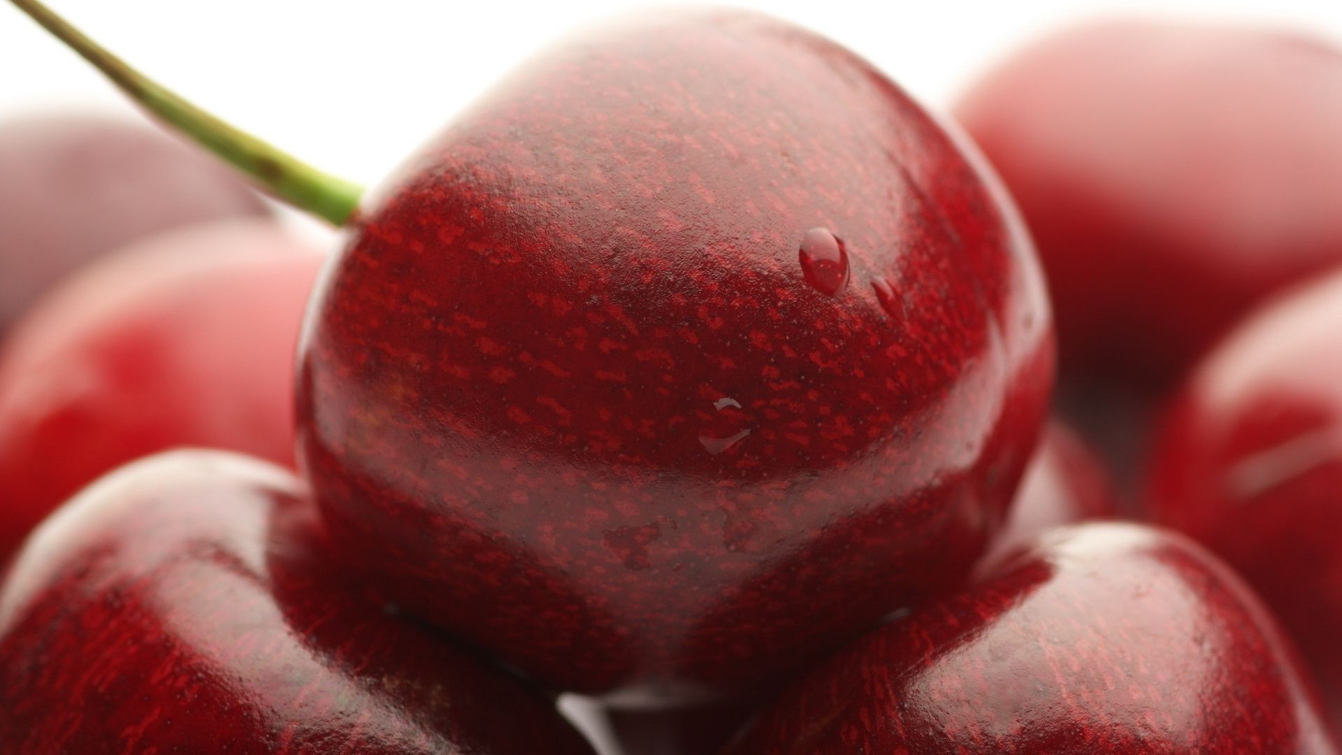 Hermosa y deliciosa cereza con gotas de agua en ella