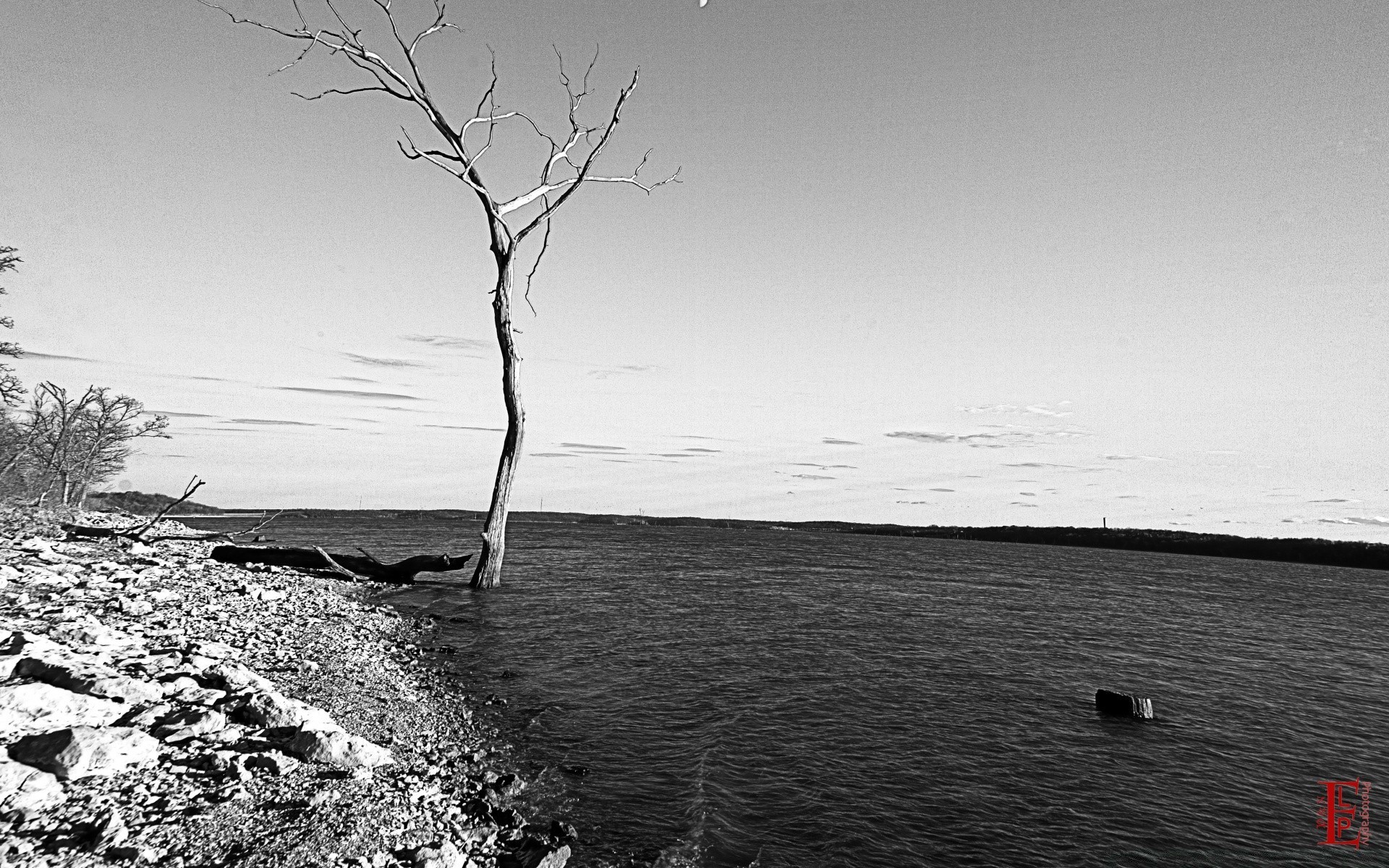 Río con árbol blanco y negro