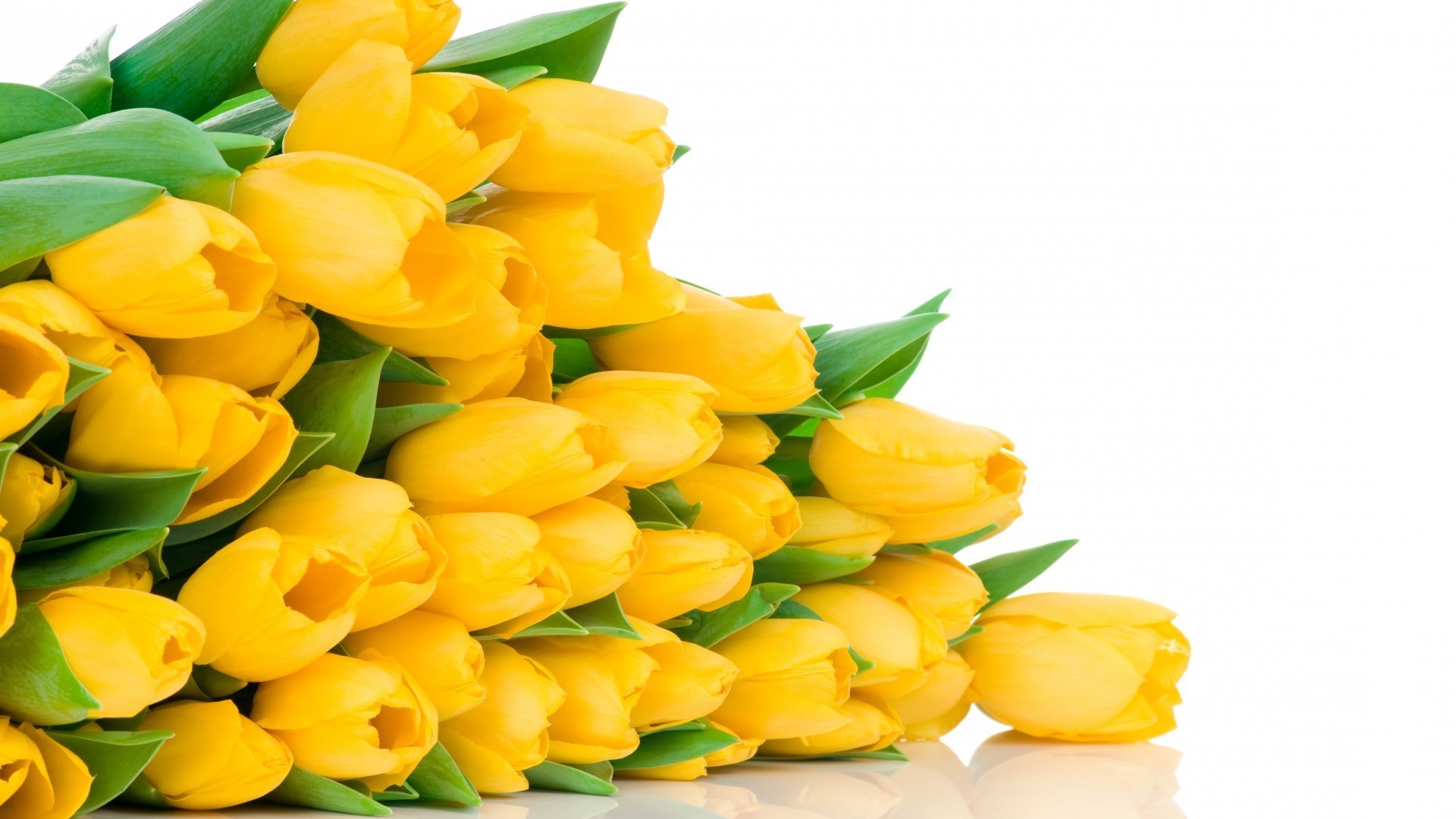 Un gran ramo de tulipanes amarillos descansa sobre la superficie sobre un fondo blanco