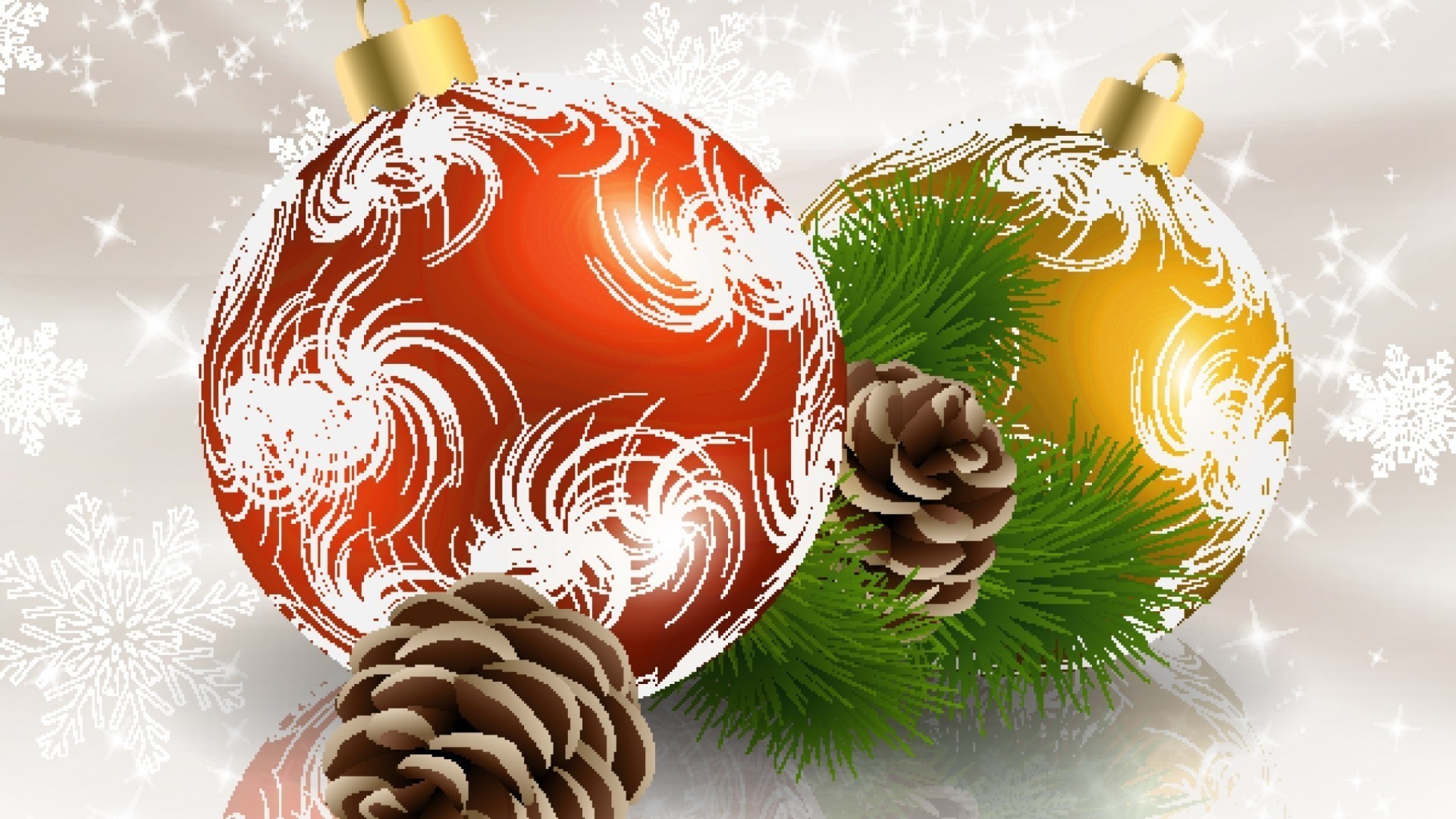 Bolas de Navidad con conos y agujas de pino estamos en un fondo gris