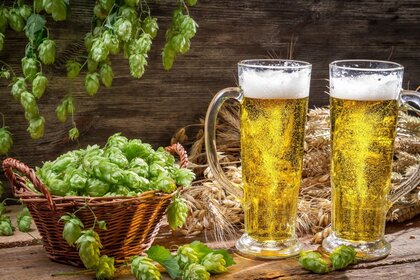 Cerveza espumosa en vasos de vidrio sobre un fondo de lúpulo y trigoCerveza espumosa en vasos de vidrio sobre un fondo de lúpulo y trigo