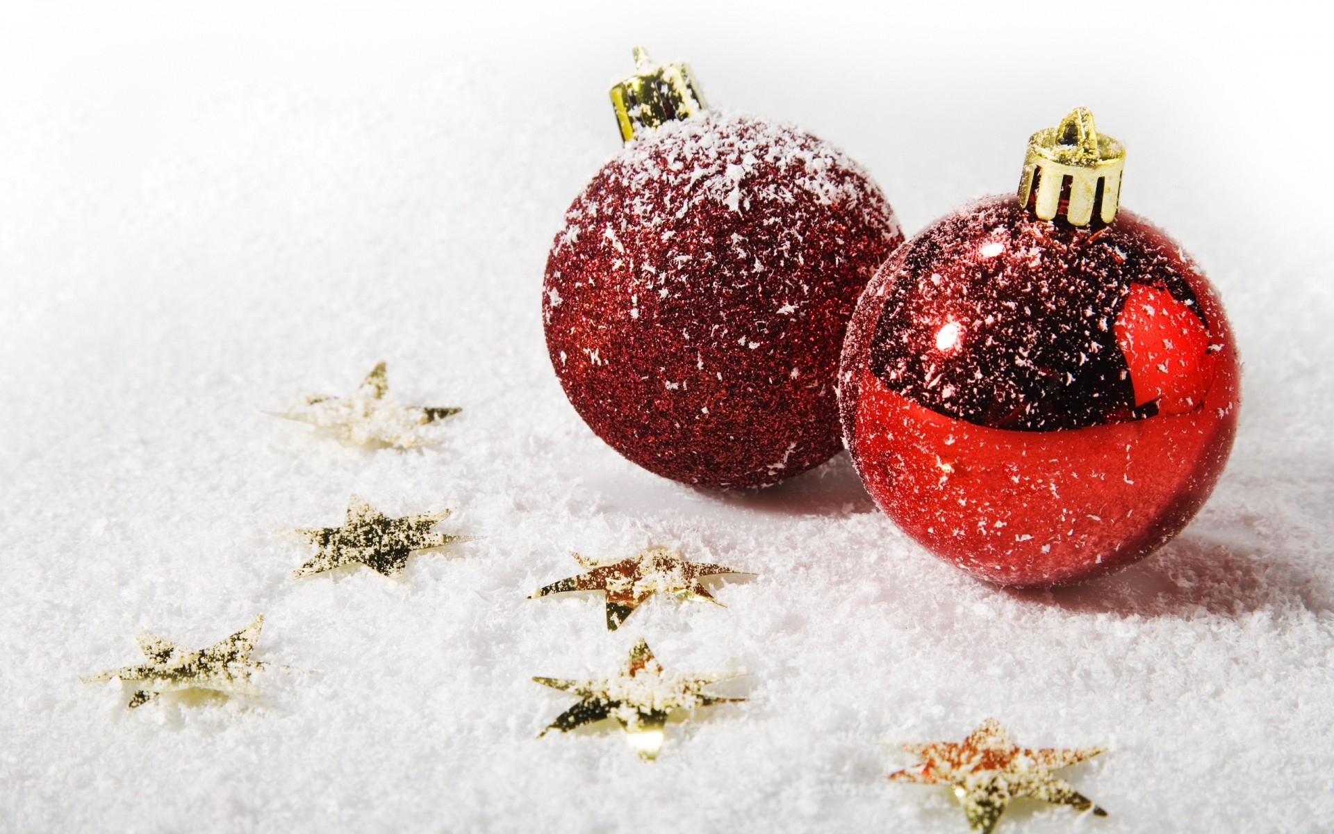 Cuentas rojas de bayas y bolas de año nuevo sobre un fondo blanco