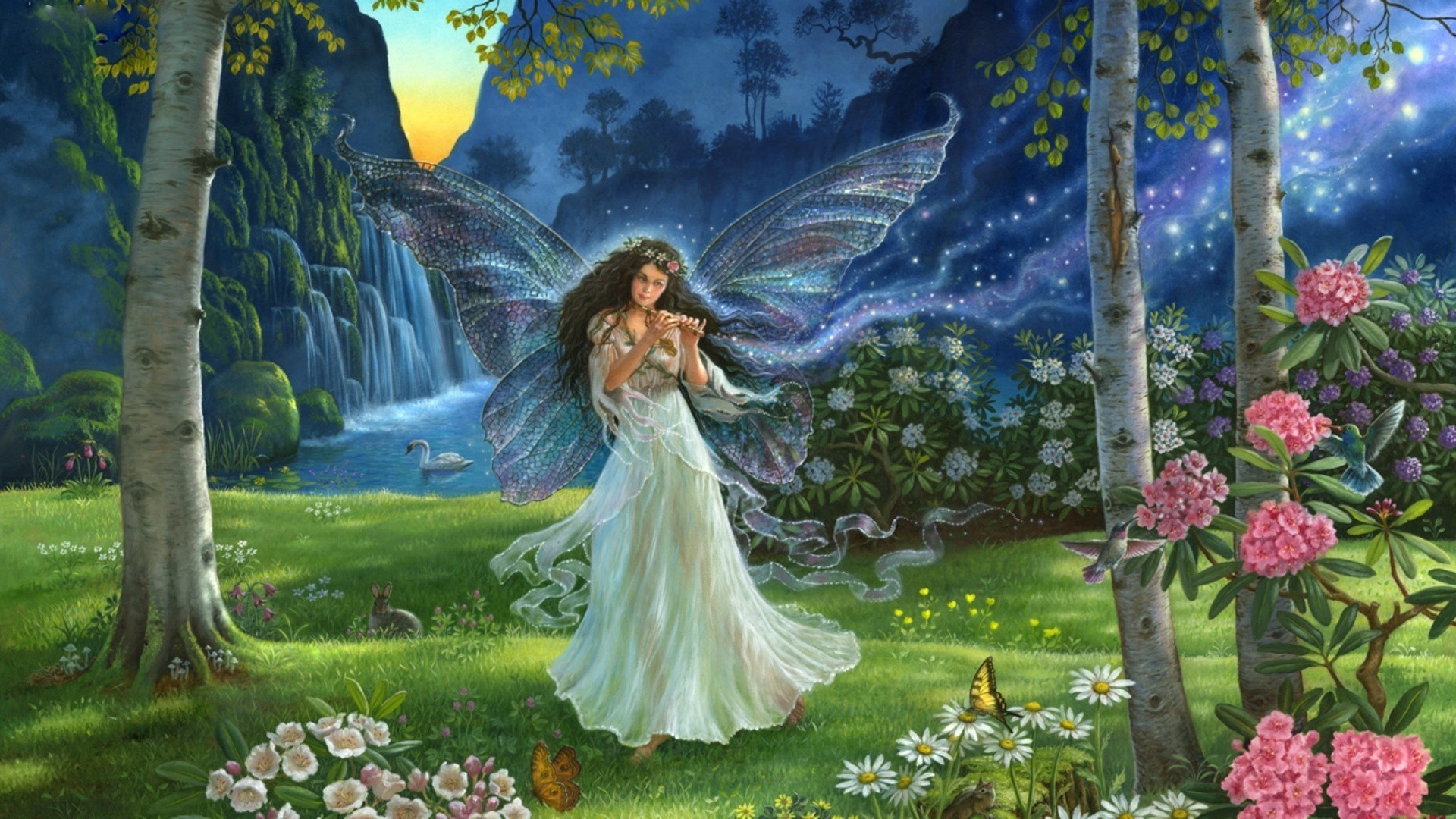 Arte aves flores lago bosque takaki caballo unicornio