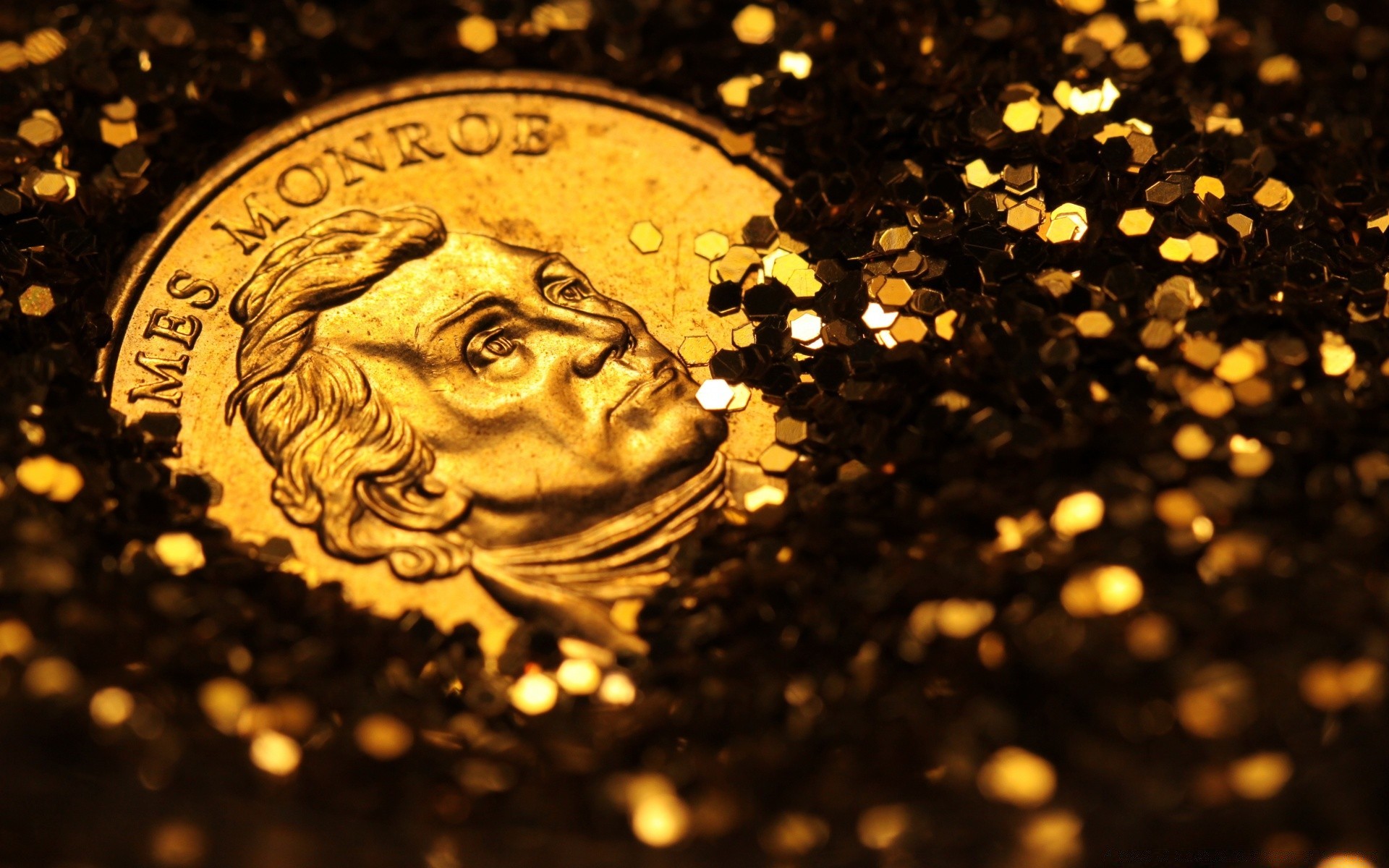 Moneda entre monedas de oro. Imagen en la moneda