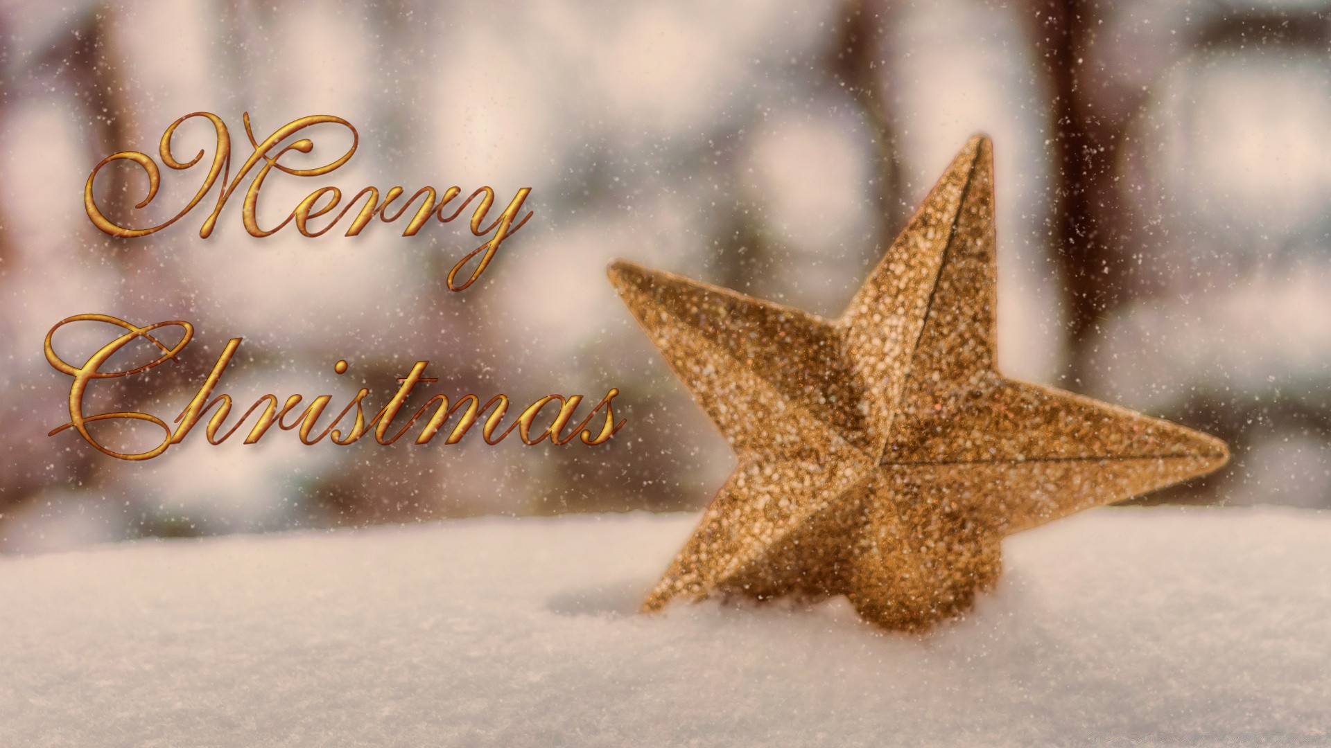 La inscripción en Inglés "feliz Navidad" en la nieve junto a las bolas azules