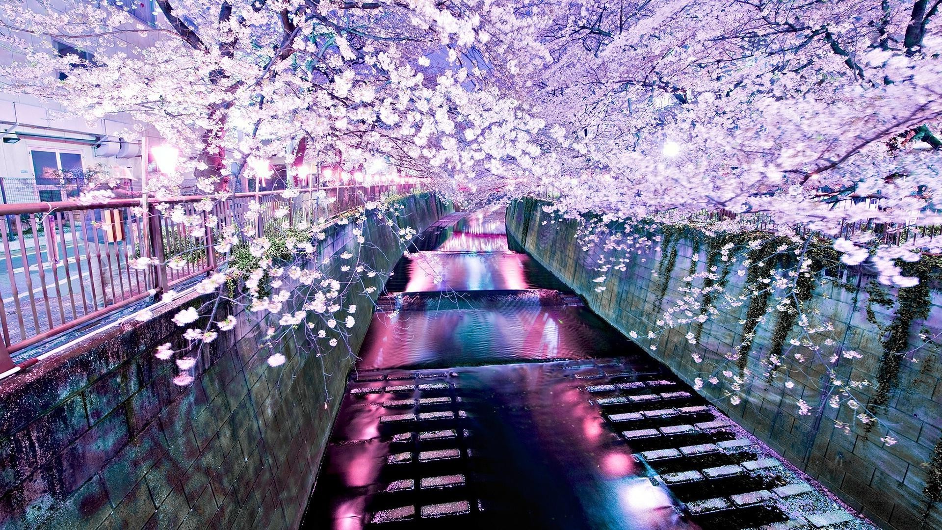 Foto del estanque con árboles de cerezo en rosa