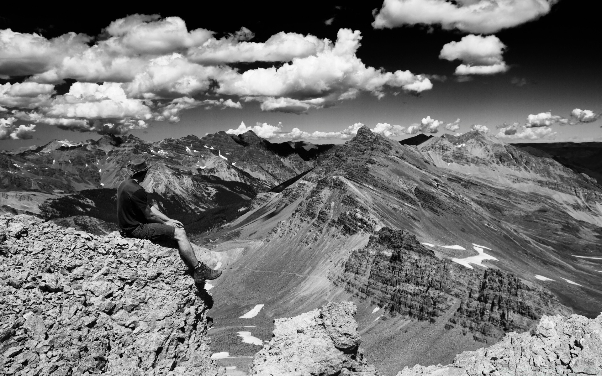Foto en blanco y negro de un hombre en un Dalek en una colina