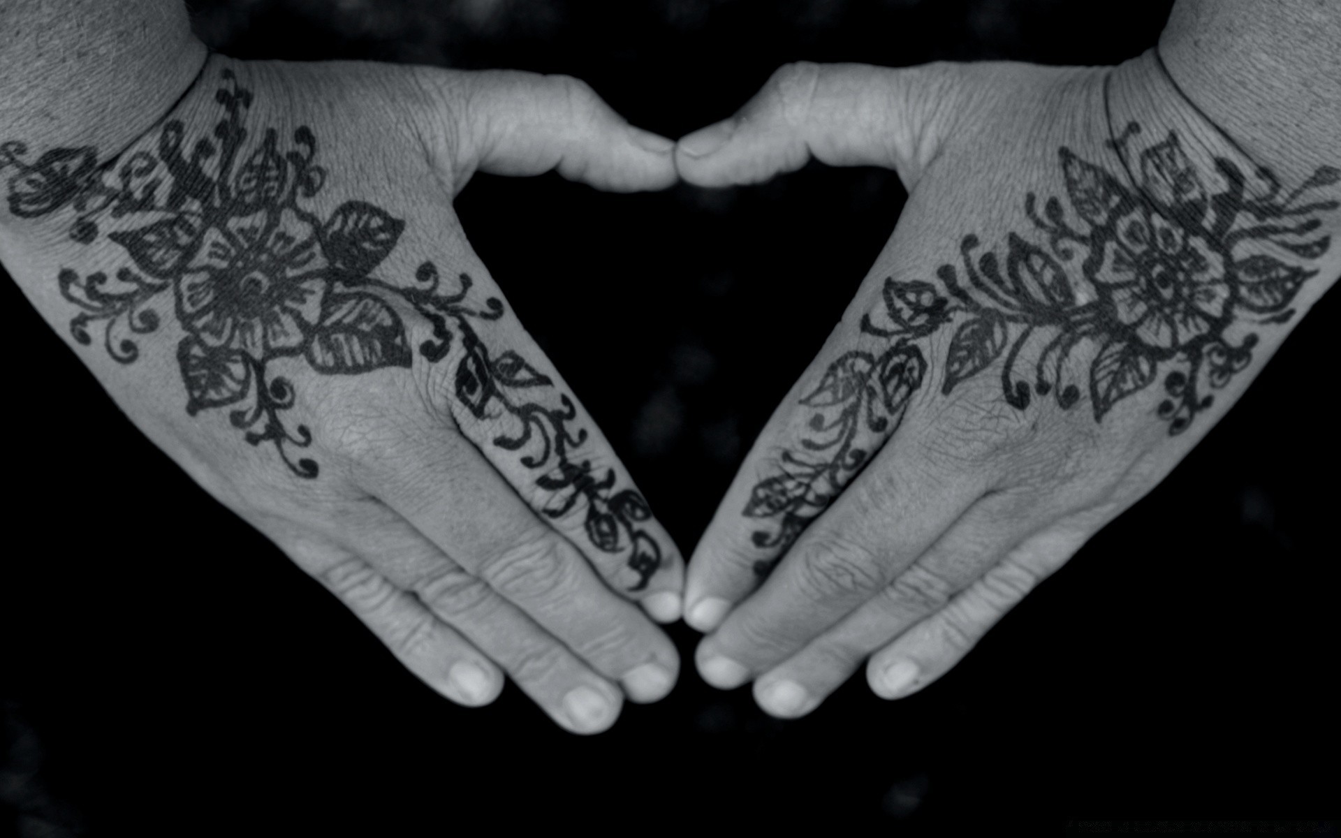 Las manos de una mujer con tatuajes rellenos simbolismo foto en blanco y negro