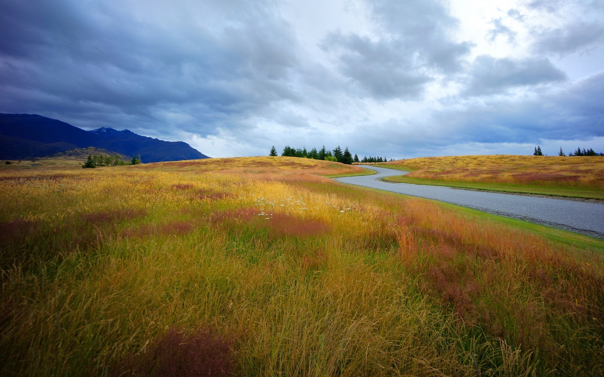 Campo floreciente en el fondo de nubes de tormentaCampo floreciente en el fondo de nubes de tormenta
