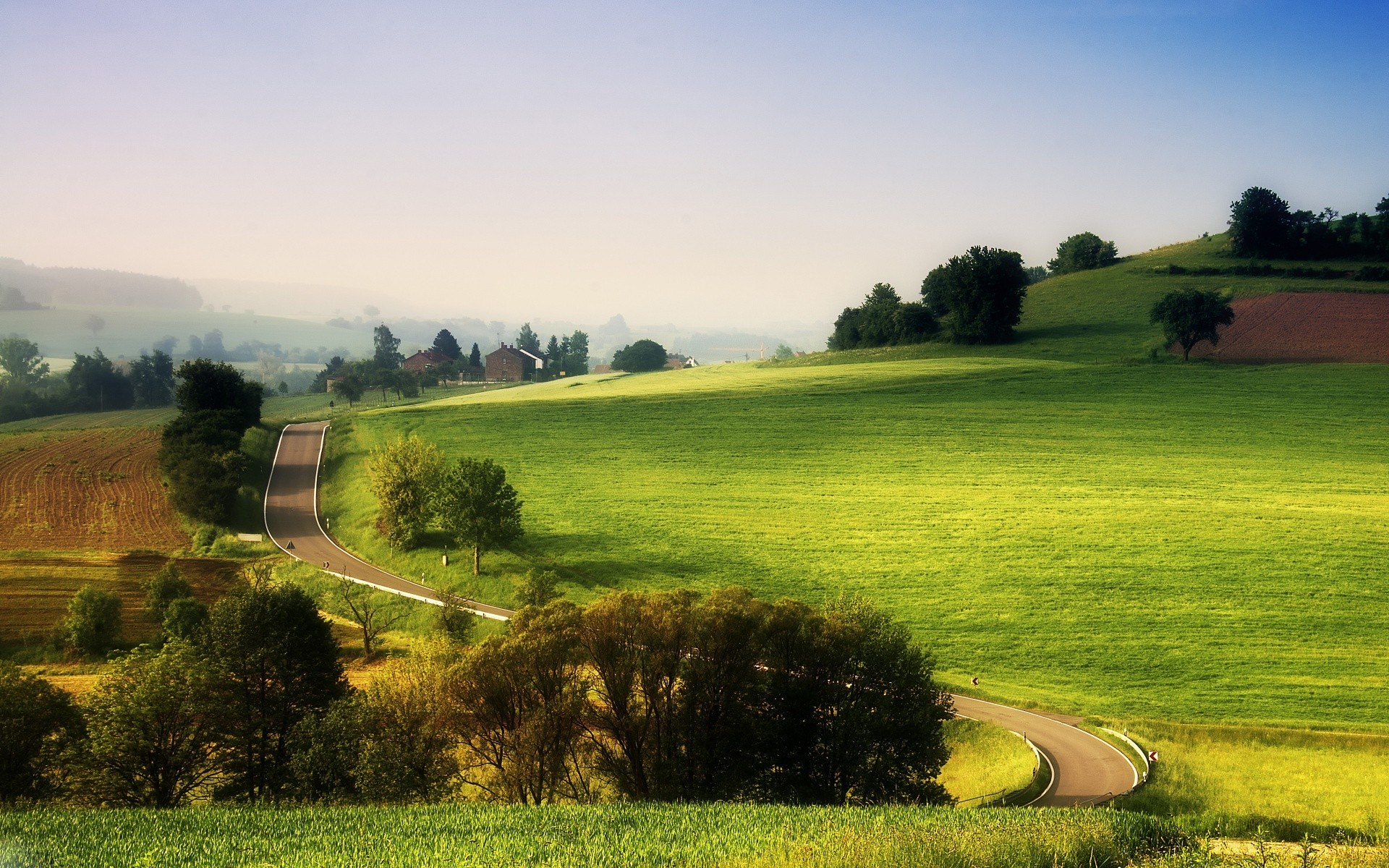 El verde joven del campo con un edificio de apartamentos visible en la distancia