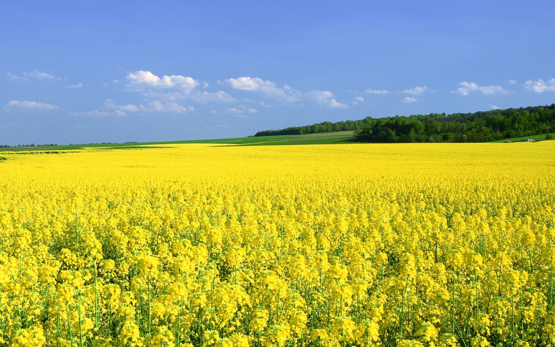Campo con flores amarillas y bosque en el fondo