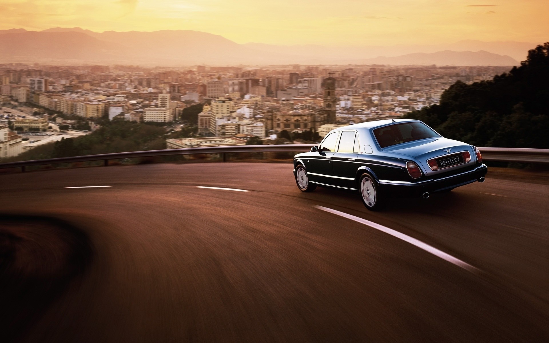 Cielo al atardecer, carretera y Bentley