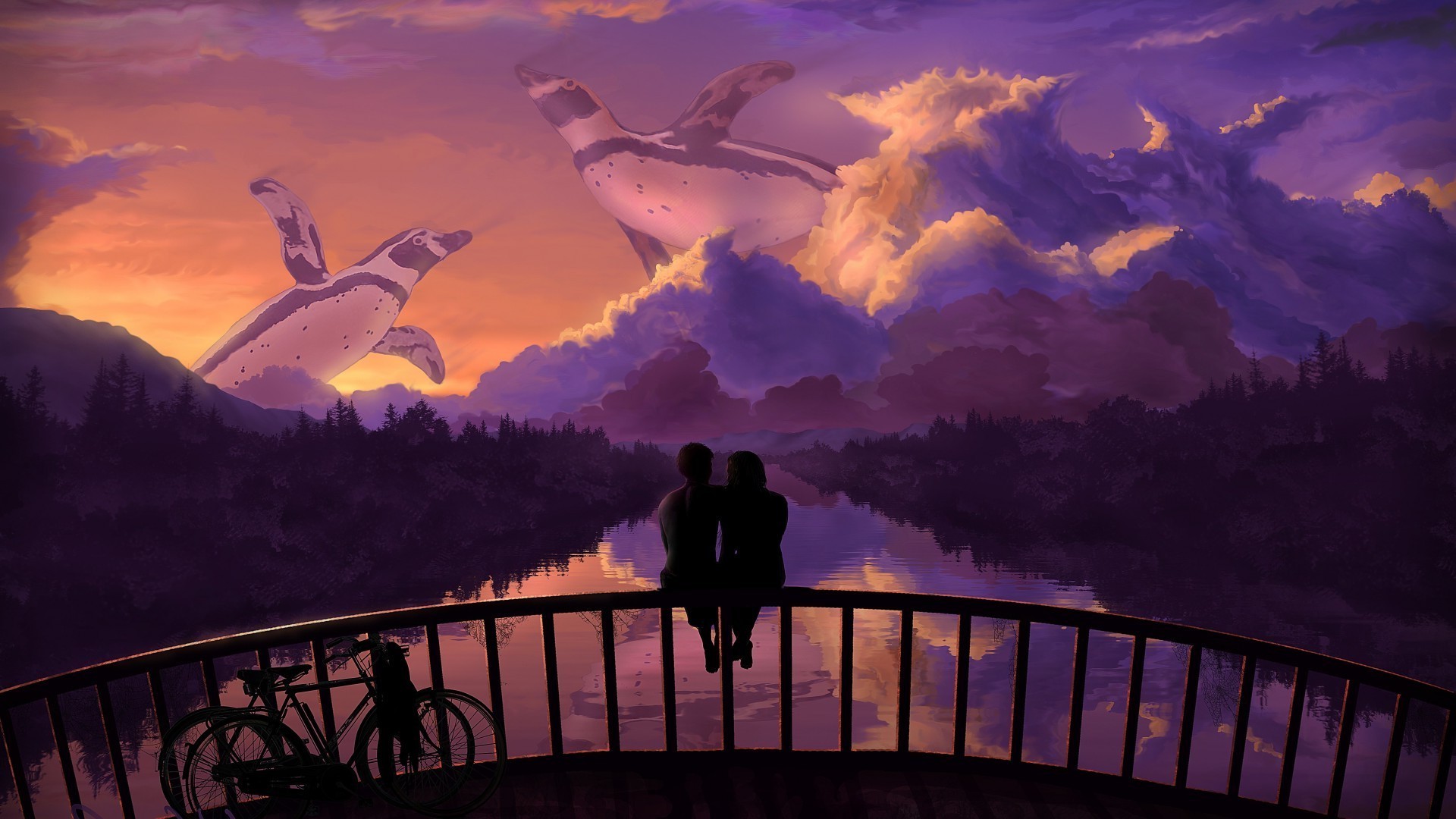 Pareja enamorada en el puente admira la puesta de sol