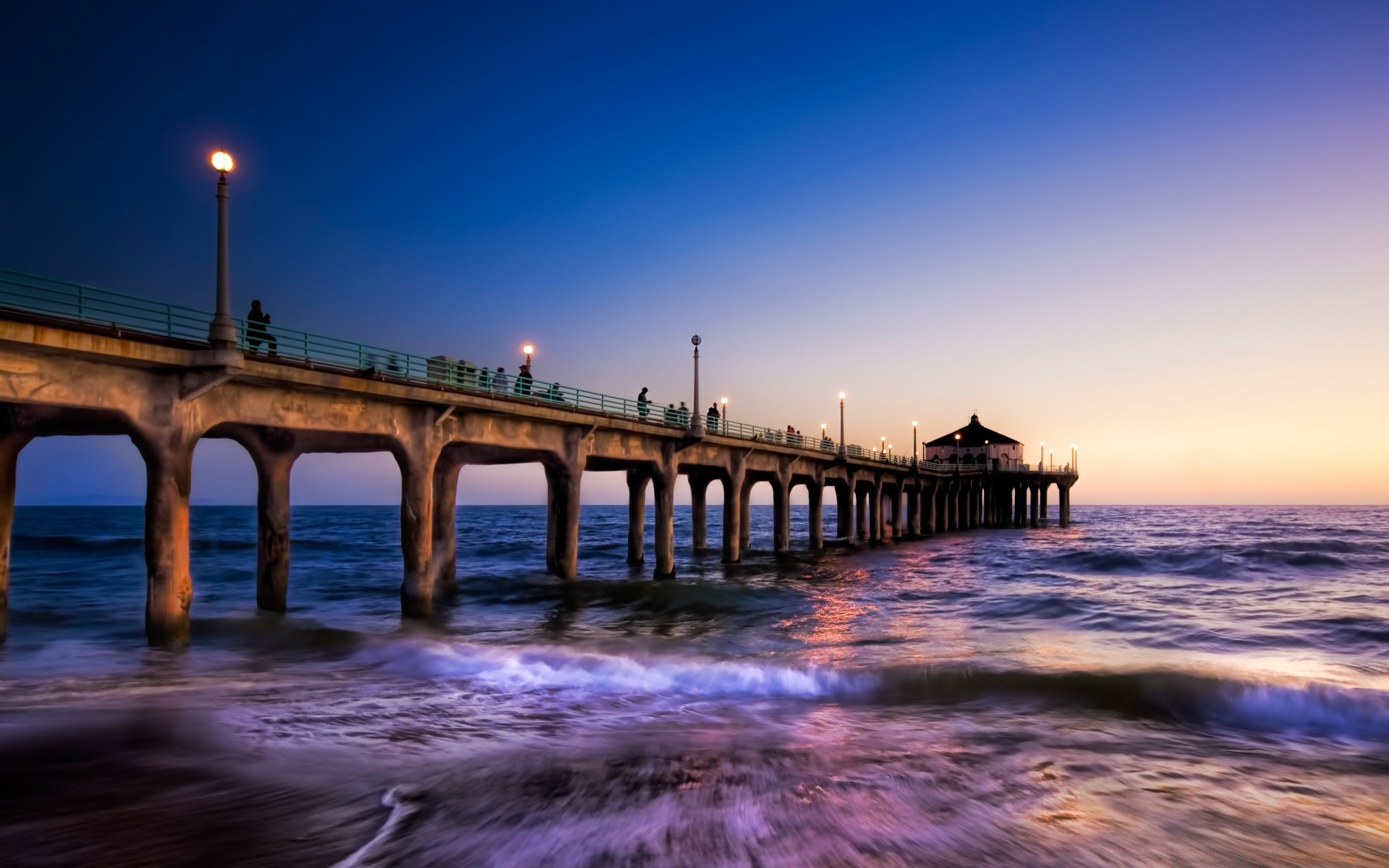 Muelle y mar agitado en medio de la puesta de sol