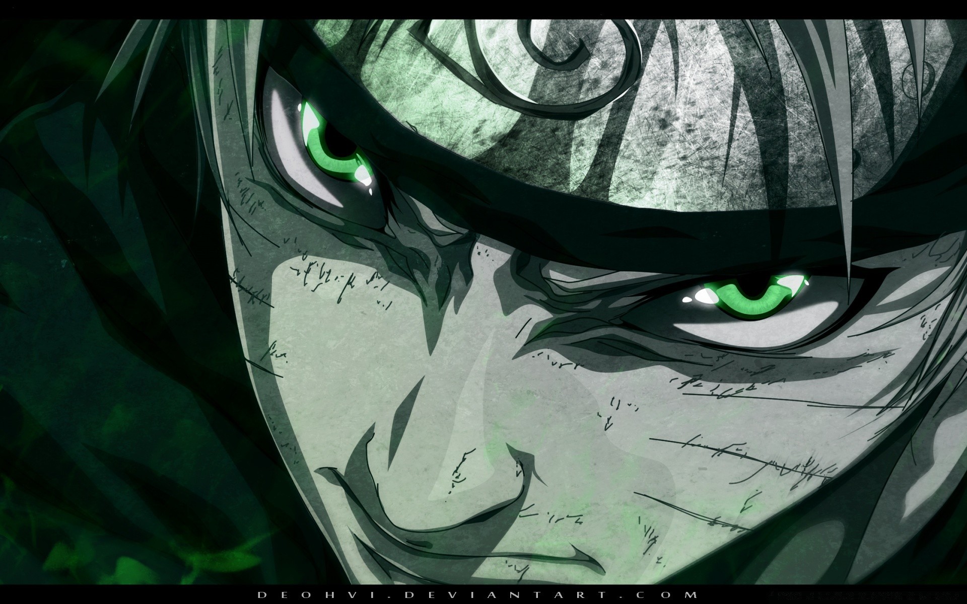 Mirada insatisfecha de un héroe de anime con pupilas verdes