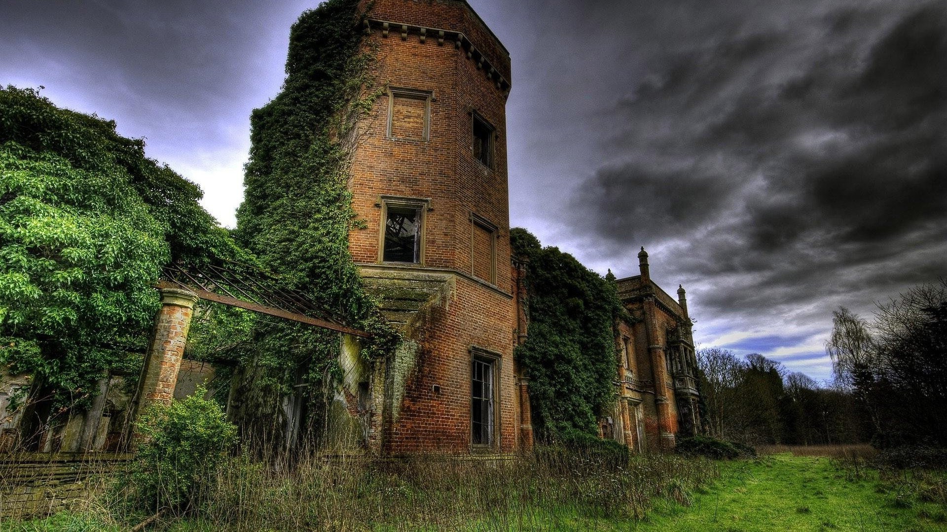 Castillo cubierto de musgo y uvas silvestres