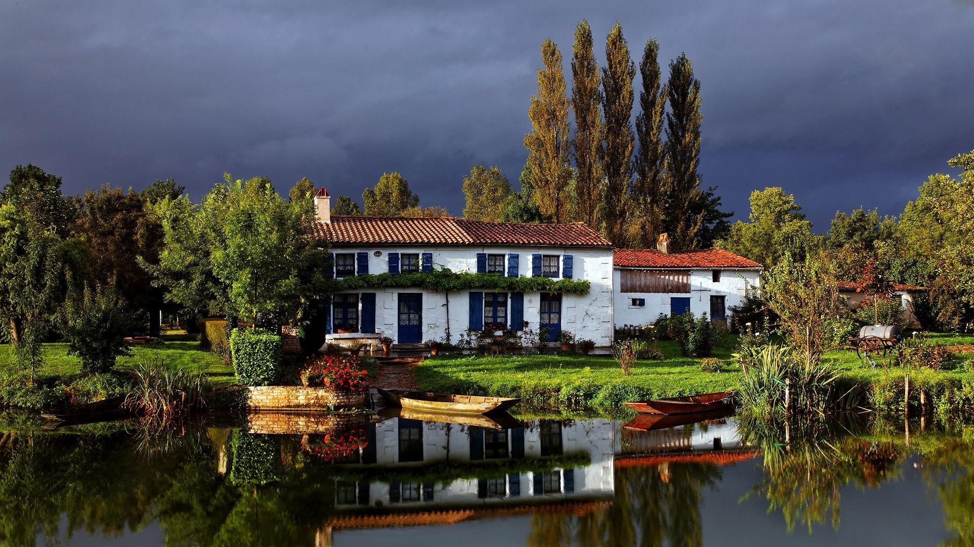 Casa en un bosque cubierto de nieve en la orilla del lago