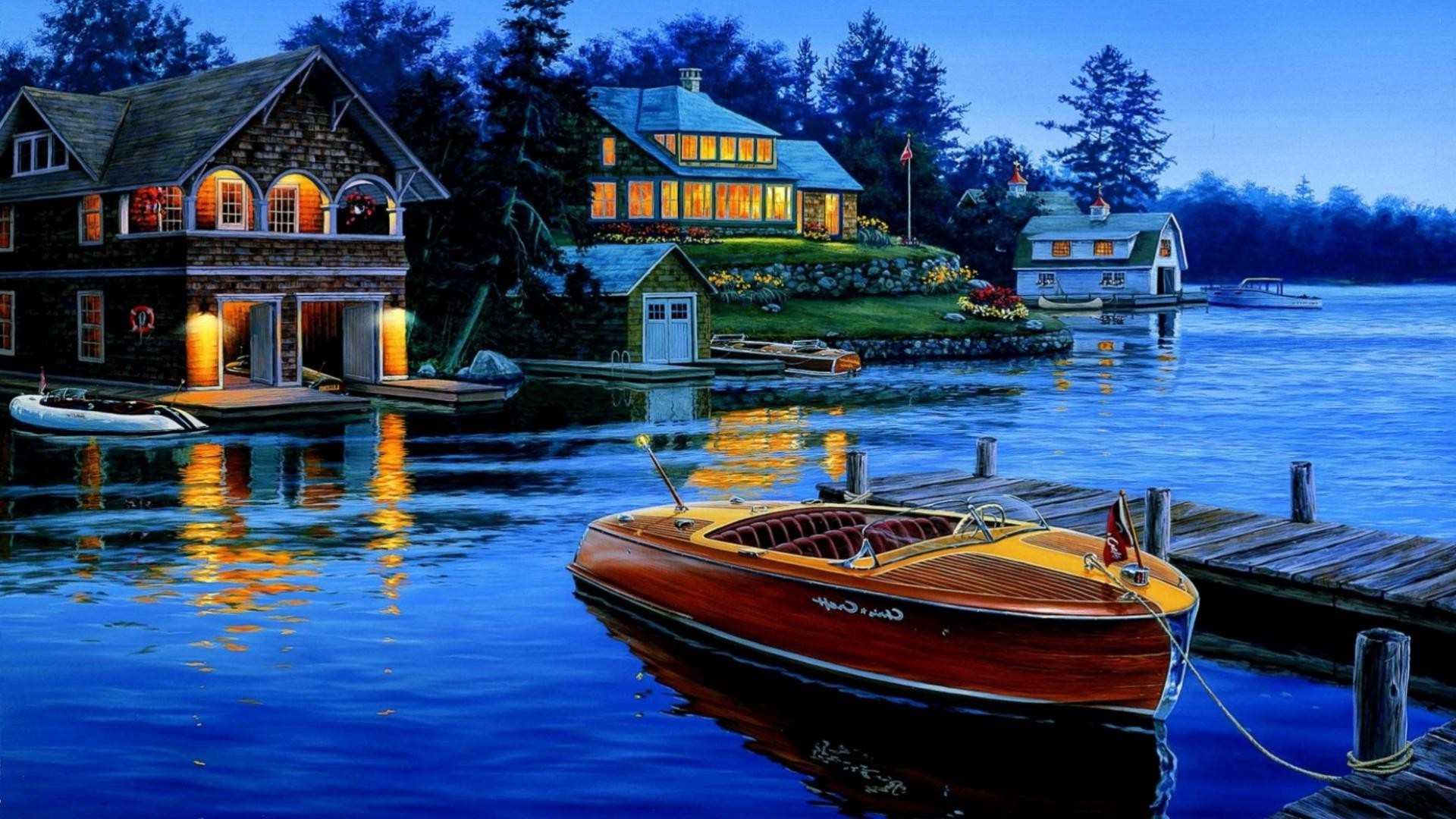 Colinas verdes. Casas al pie de las colinas. Planetas en el cielo. Magnífico paisaje