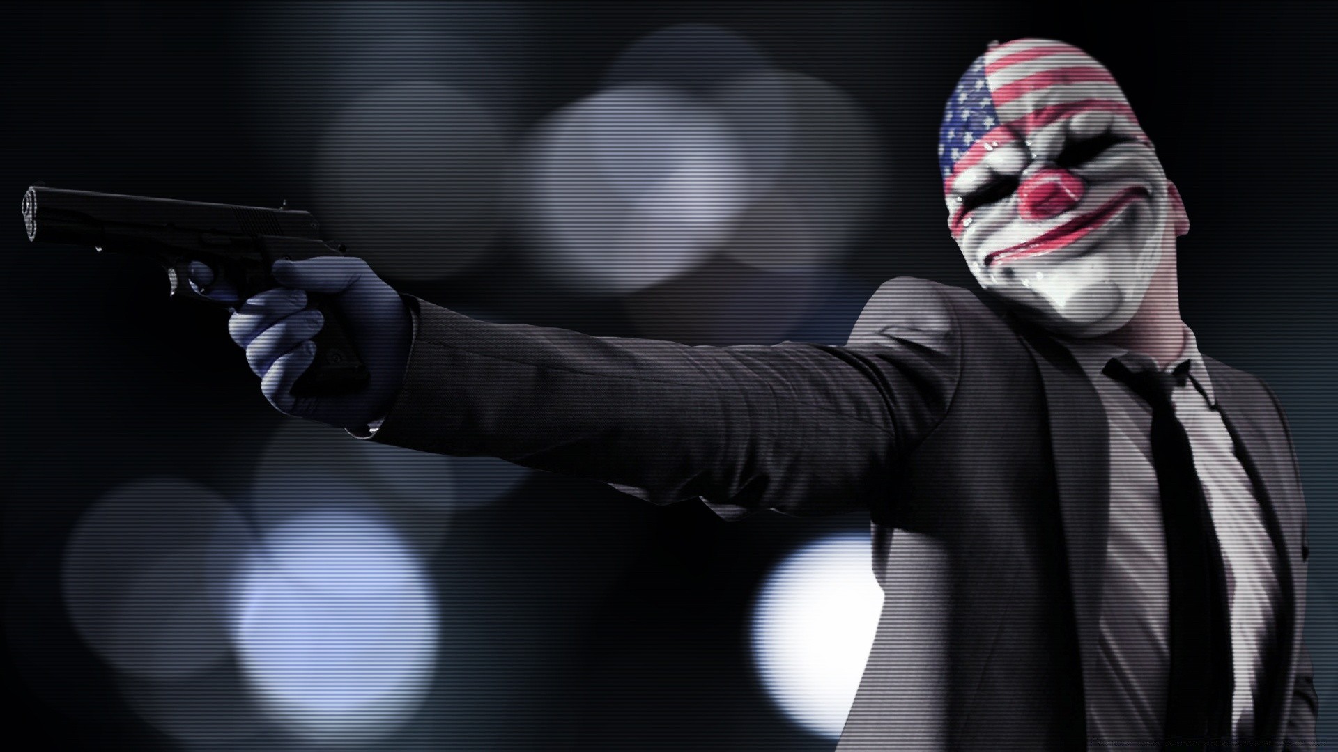 Un hombre con una pistola y una máscara con símbolos estadounidenses en la cara