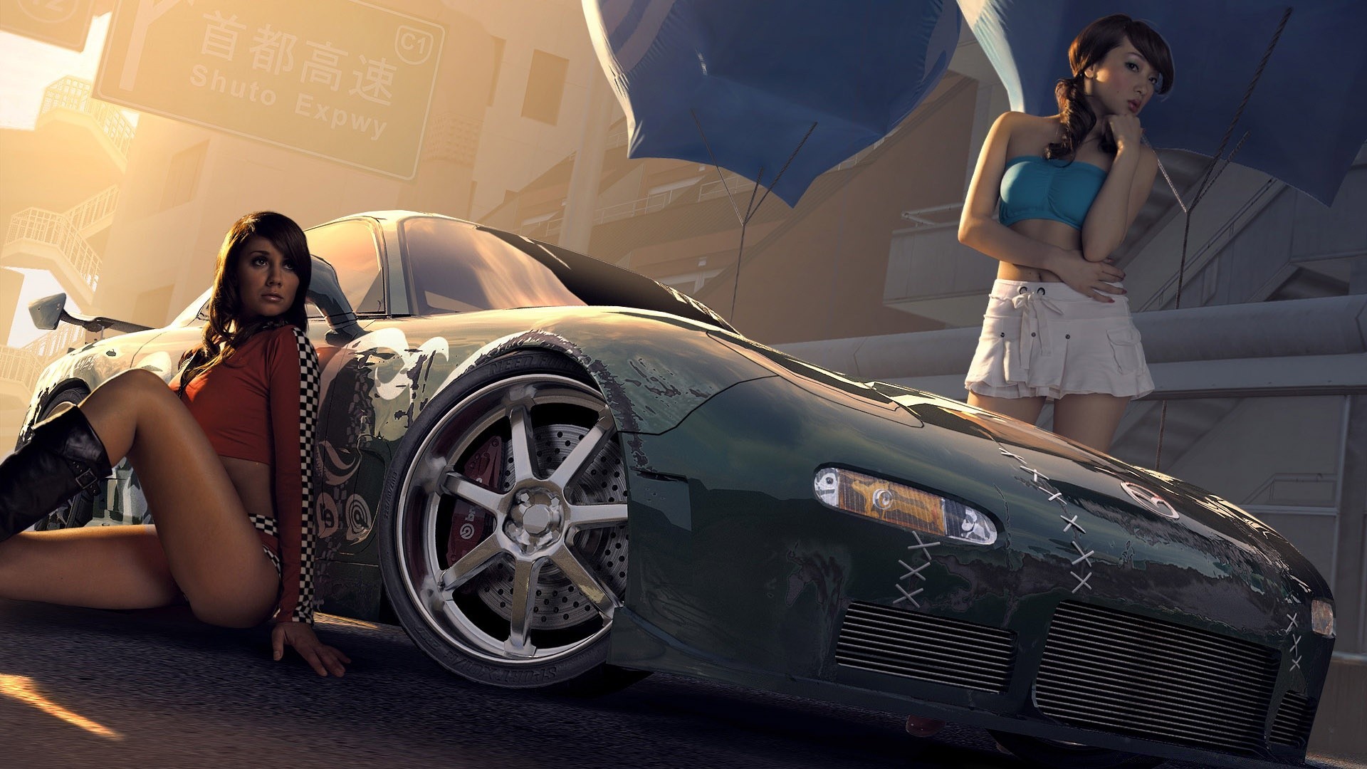 Juego sed de velocidad dos chicas cerca del coche