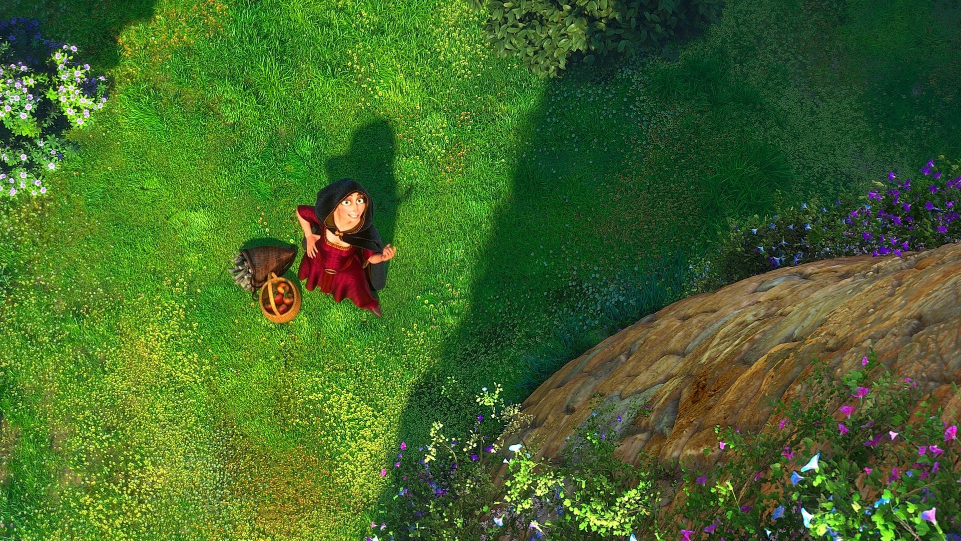 Personaje de dibujos animados rapunzel cerca de la torre sobre un fondo verde brillante