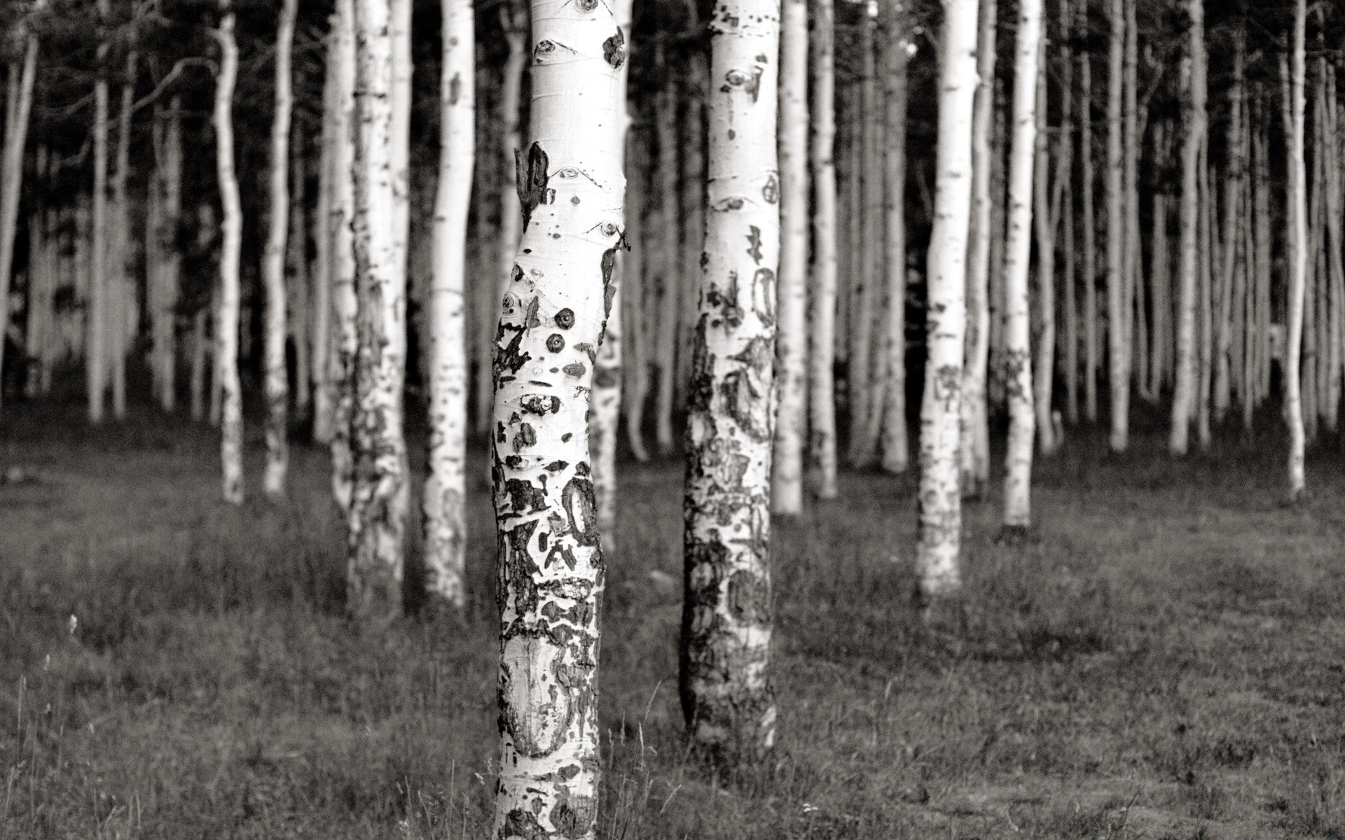 Postes de abedul en el bosque sombrío