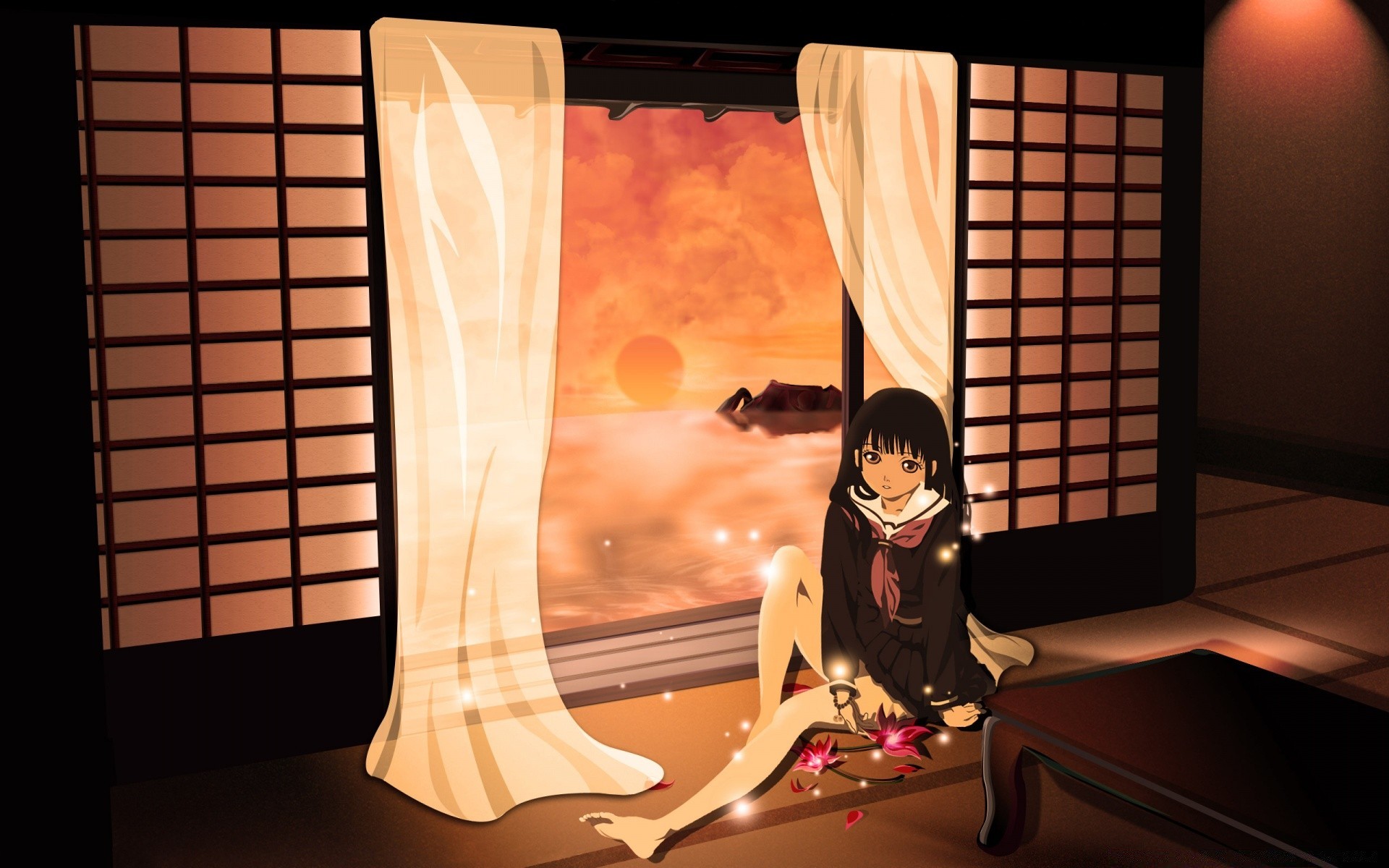Anime chica en la ventana con tul