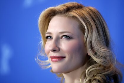 Una chica con el pelo rubio sobre un fondo azul. Sonrisa