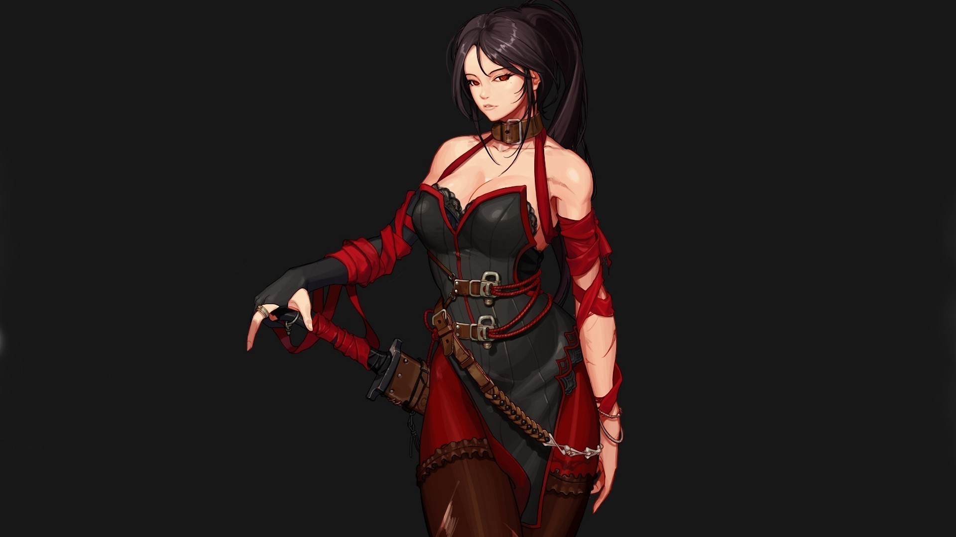 Una chica guerrera vestida de negro y rojo con una espada en una vaina