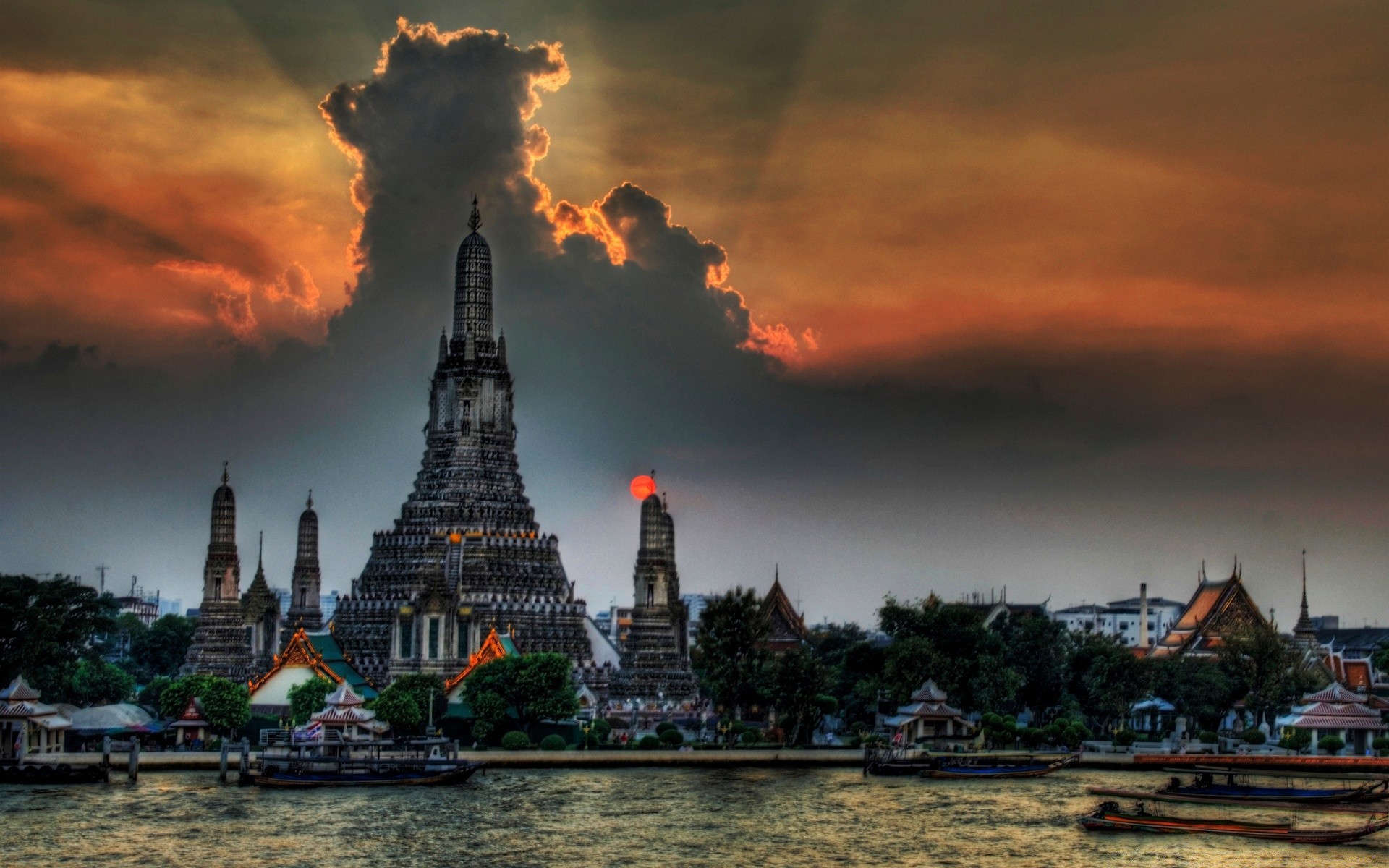 Asia, el encantador cielo de la puesta de sol sobre la arquitectura